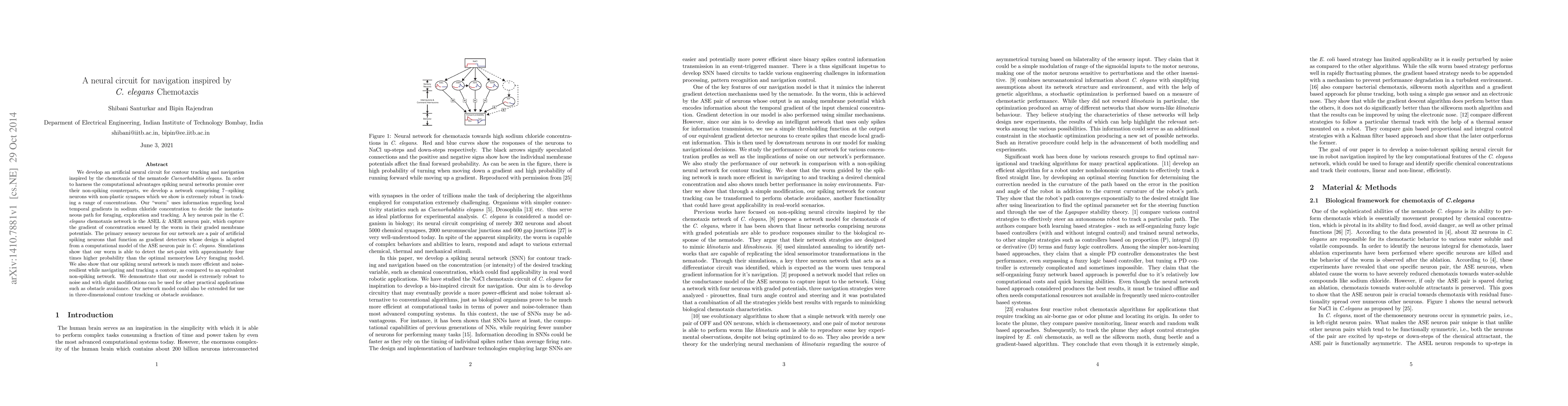 We develop an artificial neural circuit for contour tracking and navigation inspired by the chemotaxis of the nematode Caenorhabditis elegans. In order to harness the computational advantages spiking neural networks promise over their non-spiking counterparts, we develop a network comprising 7-spiking neurons with non-plastic synapses which we show is extremely robust in tracking a range of concentrations. Our worm uses information regarding local temporal gradients in sodium chloride concentration to decide the instantaneous path for foraging, exploration and tracking. A key neuron pair in the C. elegans chemotaxis network is the ASEL & ASER neuron pair, which capture the gradient of concentration sensed by the worm in their graded membrane potentials. The primary sensory neurons for our network are a pair of artificial spiking neurons that function as gradient detectors whose design is adapted from a computational model of the ASE neuron pair in C. elegans. Simulations show that our worm is able to detect the set-point with approximately four times higher probability than the optimal memoryless Levy foraging model. We also show that our spiking neural network is much more efficient and noise-resilient while navigating and tracking a contour, as compared to an equivalent non-spiking network. We demonstrate that our model is extremely robust to noise and with slight modifications can be used for other practical applications such as obstacle avoidance. Our network model could also be extended for use in three-dimensional contour tracking or obstacle avoidance.