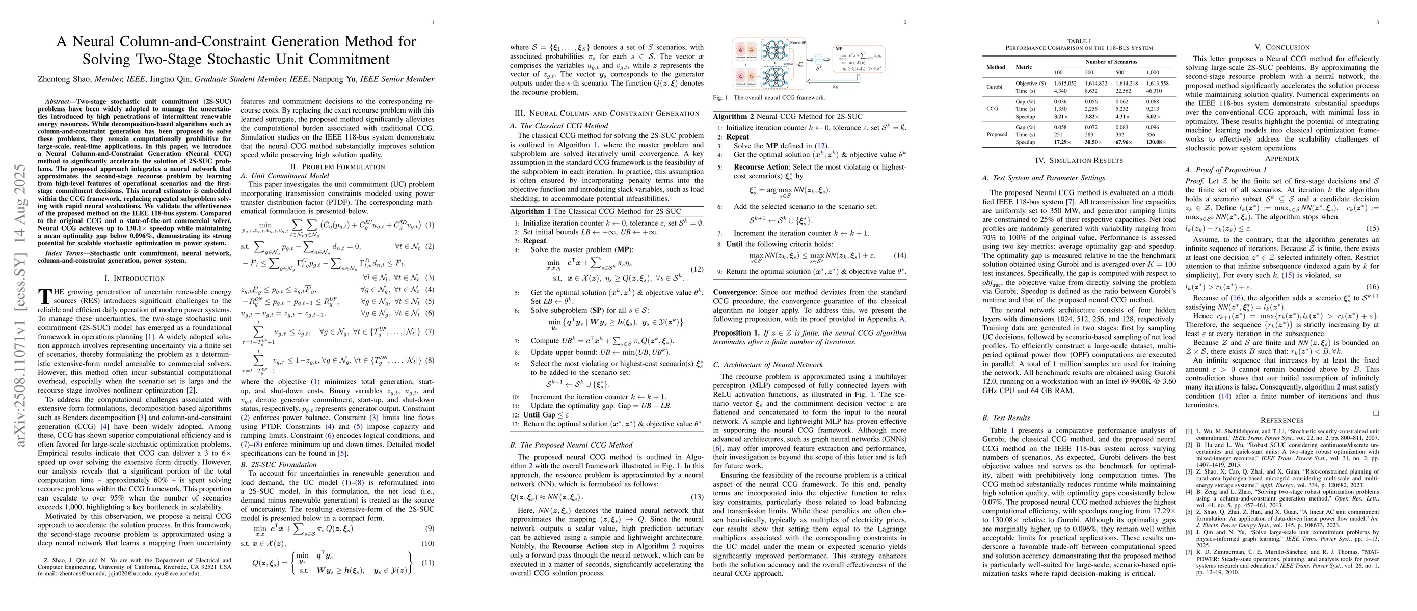 Two-stage stochastic unit commitment (2S-SUC) problems have been widely adopted to manage the uncertainties introduced by high penetrations of intermittent renewable energy resources. While decomposition-based algorithms such as column-and-constraint generation has been proposed to solve these problems, they remain computationally prohibitive for large-scale, real-time applications. In this paper, we introduce a Neural Column-and-Constraint Generation (Neural CCG) method to significantly accelerate the solution of 2S-SUC problems. The proposed approach integrates a neural network that approximates the second-stage recourse problem by learning from high-level features of operational scenarios and the first-stage commitment decisions. This neural estimator is embedded within the CCG framework, replacing repeated subproblem solving with rapid neural evaluations. We validate the effectiveness of the proposed method on the IEEE 118-bus system. Compared to the original CCG and a state-of-the-art commercial solver, Neural CCG achieves up to 130.1$\times$ speedup while maintaining a mean optimality gap below 0.096\%, demonstrating its strong potential for scalable stochastic optimization in power system.