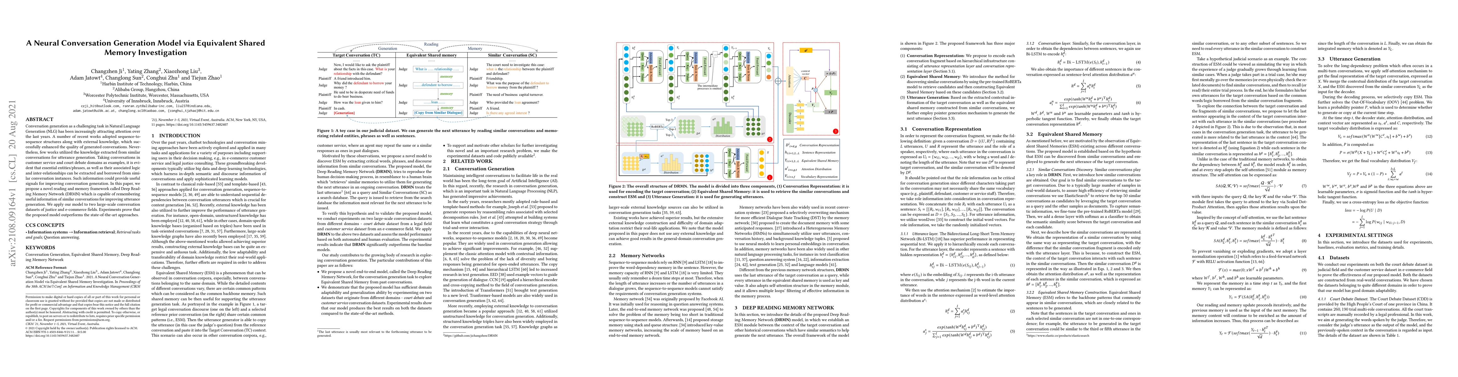This paper proposes a Deep Reading Memory Network (DRMN) to enhance conversation generation by leveraging shared memory from similar conversations. The model outperforms existing methods on large-scale datasets from justice and e-commerce domains.