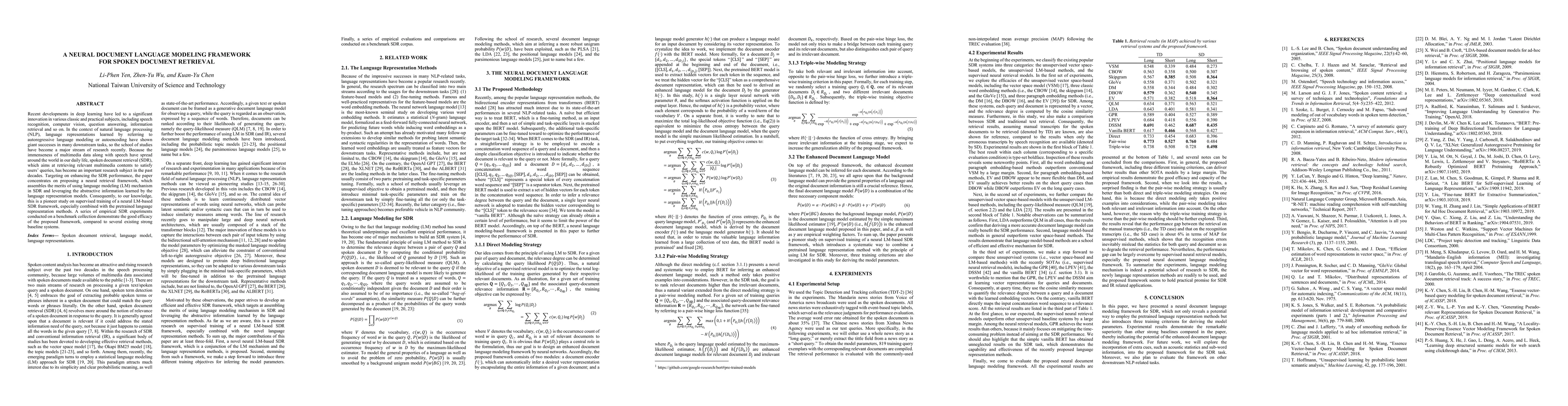 This paper proposes a neural document language modeling framework to enhance spoken document retrieval (SDR) performance by integrating language modeling and pretrained language representation methods, marking a pioneering effort in supervised training for this specific SDR framework.