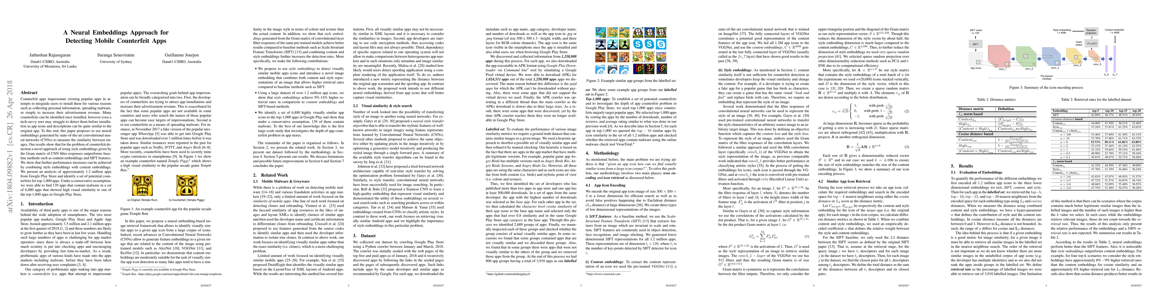 This research paper proposes a neural embeddings approach using convolutional neural networks to detect counterfeit mobile apps by measuring image similarity. The study finds that style embeddings, derived from the Gram matrix of CNN filter responses, outperform traditional methods, and combining style with content embeddings further enhances detection accuracy. The analysis of over 1.2 million apps from Google Play Store identified potential counterfeits and malware-infected apps among those showing high visual similarity to popular apps.