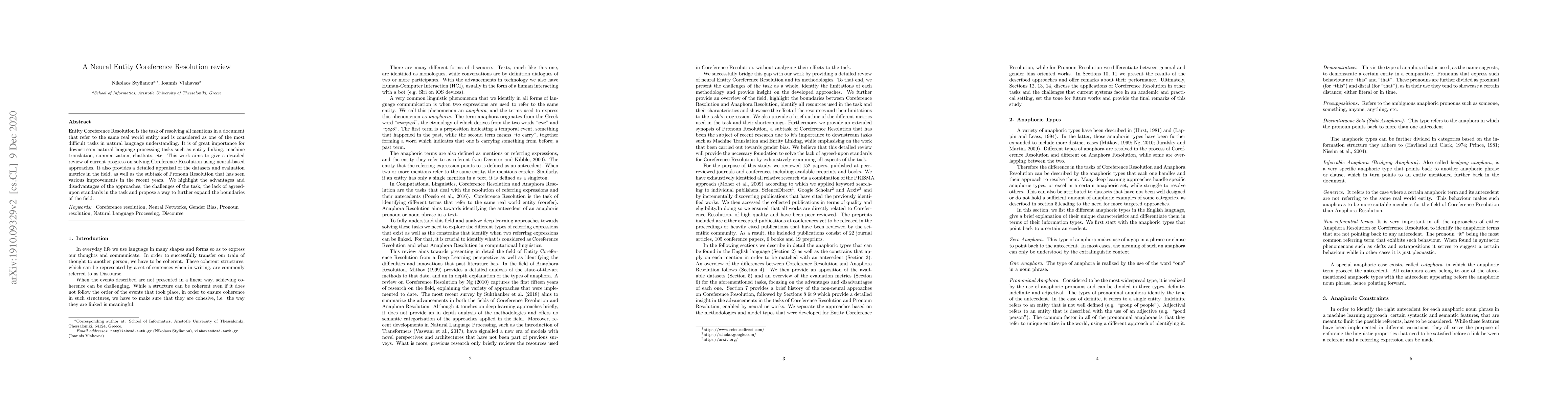 This paper reviews advancements in neural entity coreference resolution, emphasizing current neural-based approaches, challenges, and evaluation metrics. It highlights improvements in pronoun resolution and proposes ways to set future research directions.