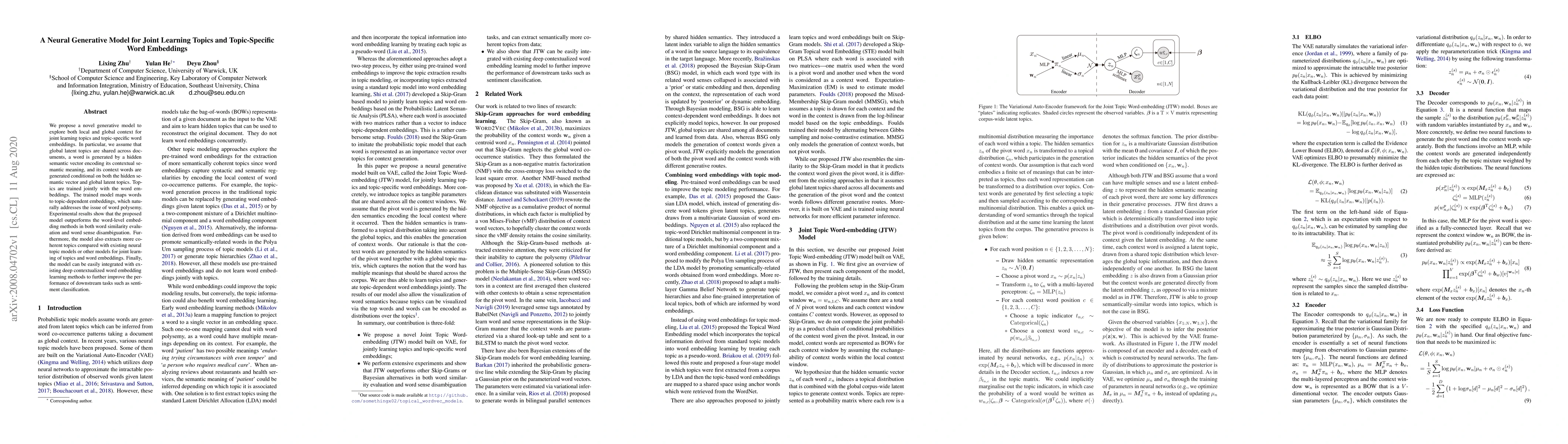 This paper introduces a generative neural model for jointly learning global latent topics and context-specific word embeddings, addressing word polysemy. The model outperforms word-level embeddings in word similarity and sense disambiguation, and extracts more coherent topics compared to existing methods.