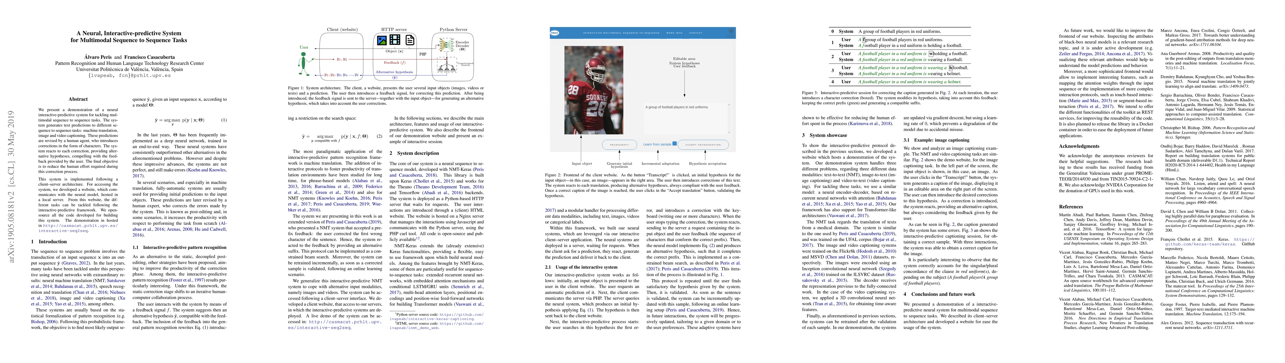 This paper introduces a neural interactive-predictive system for multimodal sequence-to-sequence tasks, including machine translation, image, and video captioning. The system incorporates human feedback to refine predictions, aiming to reduce human effort in the correction process.