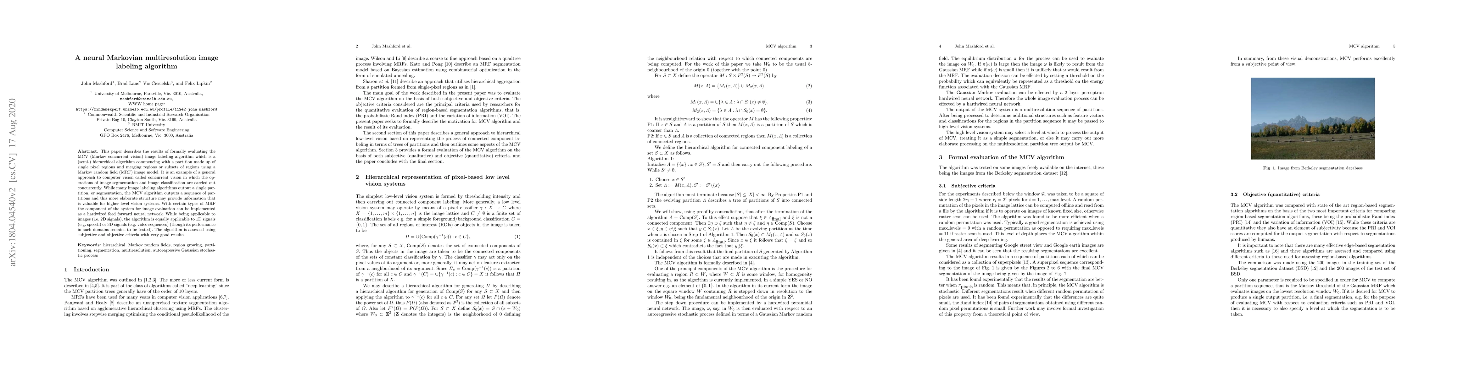 This paper describes the results of formally evaluating the MCV (Markov concurrent vision) image labeling algorithm which is a (semi-) hierarchical algorithm commencing with a partition made up of single pixel regions and merging regions or subsets of regions using a Markov random field (MRF) image model. It is an example of a general approach to computer vision called concurrent vision in which the operations of image segmentation and image classification are carried out concurrently. While many image labeling algorithms output a single partition, or segmentation, the MCV algorithm outputs a sequence of partitions and this more elaborate structure may provide information that is valuable for higher level vision systems. With certain types of MRF the component of the system for image evaluation can be implemented as a hardwired feed forward neural network. While being applicable to images (i.e. 2D signals), the algorithm is equally applicable to 1D signals (e.g. speech) or 3D signals (e.g. video sequences) (though its performance in such domains remains to be tested). The algorithm is assessed using subjective and objective criteria with very good results.