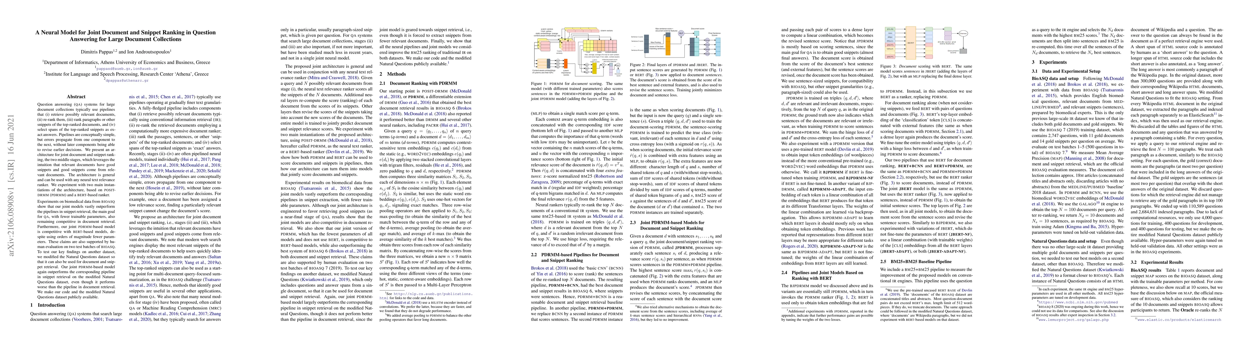 This paper proposes a neural model for joint document and snippet ranking in question answering systems, aiming to improve snippet retrieval performance. The model outperforms traditional pipeline methods in snippet retrieval while using fewer parameters and remaining competitive in document retrieval, as demonstrated on biomedical and modified Natural Questions datasets.