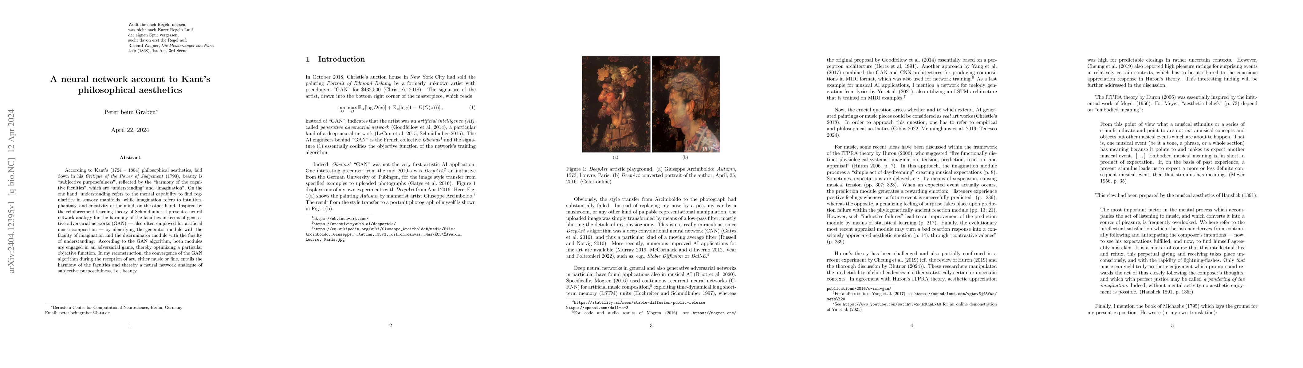 According to Kant's (1724 -- 1804) philosophical aesthetics, laid down in his Critique of the Power of Judgement (1790), beauty is "subjective purposefulness", reflected by the "harmony of the cognitive faculties", which are "understanding" and "imagination". On the one hand, understanding refers to the mental capability to find regularities in sensory manifolds, while imagination refers to intuition, fantasy, and creativity of the mind, on the other hand. Inspired by the reinforcement learning theory of Schmidhuber, I present a neural network analogy for the harmony of the faculties in terms of generative adversarial networks (GAN) - also often employed for artificial music composition -- by identifying the generator module with the faculty of imagination and the discriminator module with the faculty of understanding. According to the GAN algorithm, both modules are engaged in an adversarial game, thereby optimizing a particular objective function. In my reconstruction, the convergence of the GAN algorithm during the reception of art, either music or fine, entails the harmony of the faculties and thereby a neural network analogue of subjective purposefulness, i.e., beauty.
