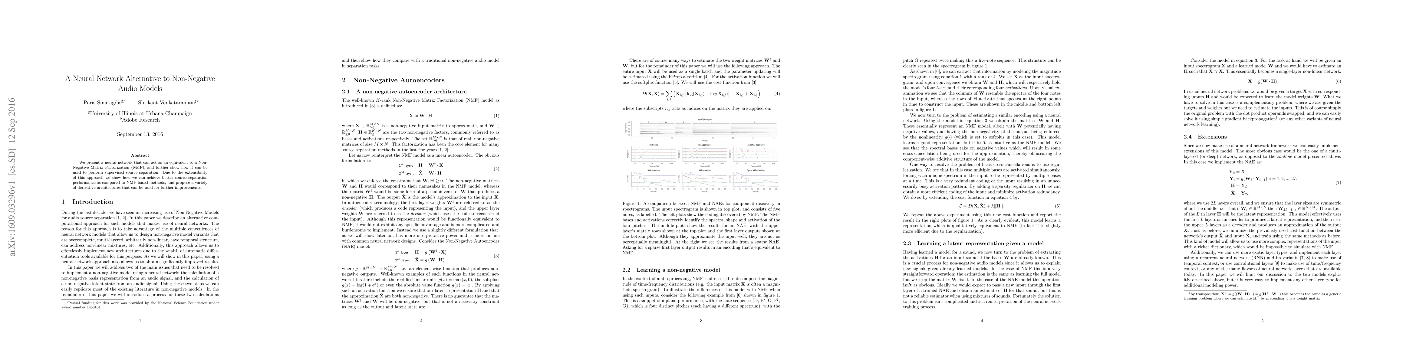 This paper introduces a neural network alternative to Non-Negative Matrix Factorization (NMF) for audio source separation, demonstrating superior performance and proposing various derivative architectures for further enhancements. The approach shows better separation results compared to traditional NMF-based methods.