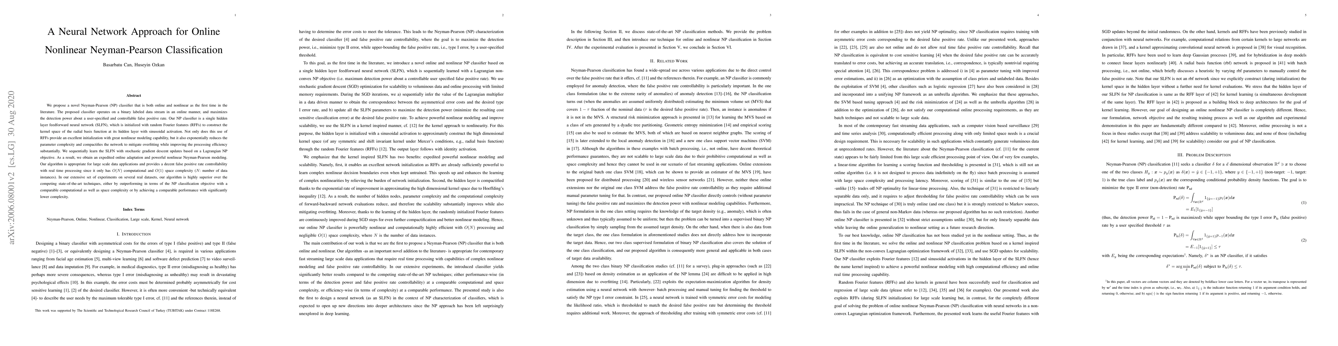 We propose a novel Neyman-Pearson (NP) classifier that is both online and nonlinear as the first time in the literature. The proposed classifier operates on a binary labeled data stream in an online manner, and maximizes the detection power about a user-specified and controllable false positive rate. Our NP classifier is a single hidden layer feedforward neural network (SLFN), which is initialized with random Fourier features (RFFs) to construct the kernel space of the radial basis function at its hidden layer with sinusoidal activation. Not only does this use of RFFs provide an excellent initialization with great nonlinear modeling capability, but it also exponentially reduces the parameter complexity and compactifies the network to mitigate overfitting while improving the processing efficiency substantially. We sequentially learn the SLFN with stochastic gradient descent updates based on a Lagrangian NP objective. As a result, we obtain an expedited online adaptation and powerful nonlinear Neyman-Pearson modeling. Our algorithm is appropriate for large scale data applications and provides a decent false positive rate controllability with real time processing since it only has O(N) computational and O(1) space complexity (N: number of data instances). In our extensive set of experiments on several real datasets, our algorithm is highly superior over the competing state-of-the-art techniques, either by outperforming in terms of the NP classification objective with a comparable computational as well as space complexity or by achieving a comparable performance with significantly lower complexity.