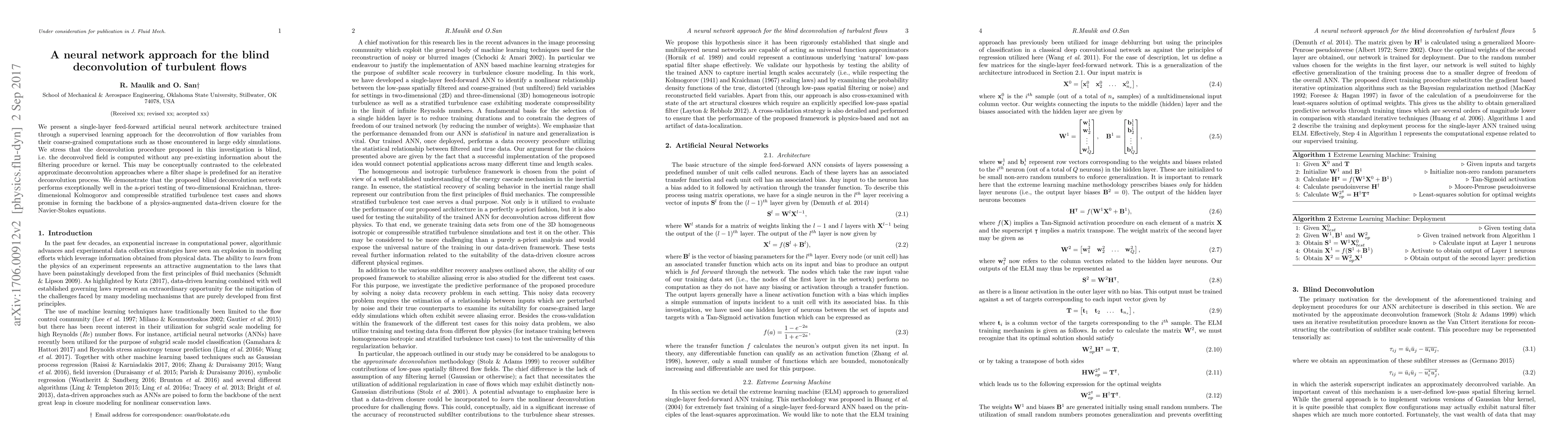 We present a single-layer feedforward artificial neural network architecture trained through a supervised learning approach for the deconvolution of flow variables from their coarse grained computations such as those encountered in large eddy simulations. We stress that the deconvolution procedure proposed in this investigation is blind, i.e. the deconvolved field is computed without any pre-existing information about the filtering procedure or kernel. This may be conceptually contrasted to the celebrated approximate deconvolution approaches where a filter shape is predefined for an iterative deconvolution process. We demonstrate that the proposed blind deconvolution network performs exceptionally well in the a-priori testing of both two-dimensional Kraichnan and three-dimensional Kolmogorov turbulence and shows promise in forming the backbone of a physics-augmented data-driven closure for the Navier-Stokes equations.