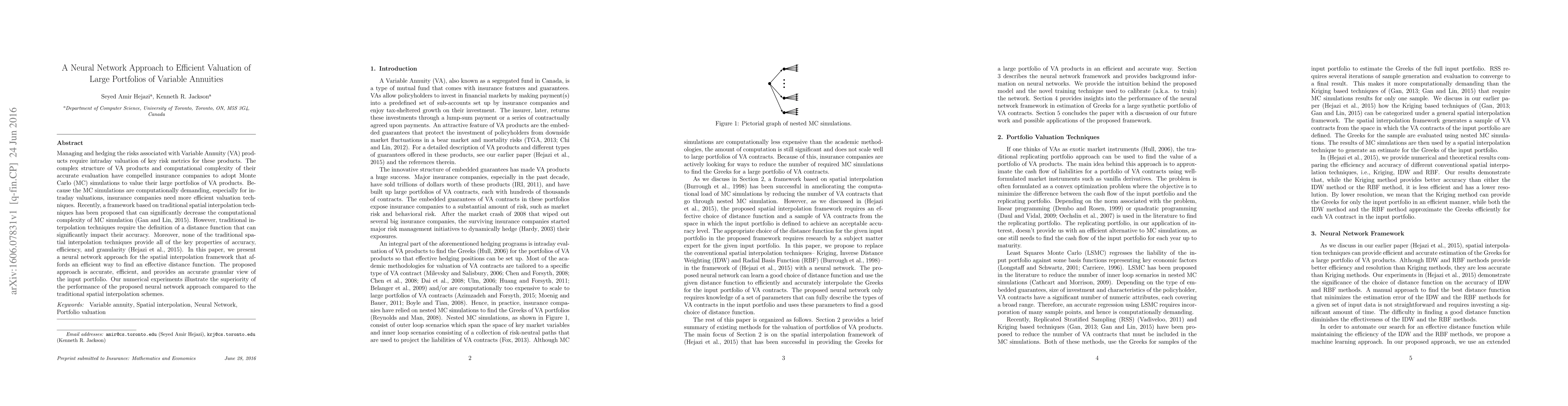 Managing and hedging the risks associated with Variable Annuity (VA) products require intraday valuation of key risk metrics for these products. The complex structure of VA products and computational complexity of their accurate evaluation have compelled insurance companies to adopt Monte Carlo (MC) simulations to value their large portfolios of VA products. Because the MC simulations are computationally demanding, especially for intraday valuations, insurance companies need more efficient valuation techniques. Recently, a framework based on traditional spatial interpolation techniques has been proposed that can significantly decrease the computational complexity of MC simulation (Gan and Lin, 2015). However, traditional interpolation techniques require the definition of a distance function that can significantly impact their accuracy. Moreover, none of the traditional spatial interpolation techniques provide all of the key properties of accuracy, efficiency, and granularity (Hejazi et al., 2015). In this paper, we present a neural network approach for the spatial interpolation framework that affords an efficient way to find an effective distance function. The proposed approach is accurate, efficient, and provides an accurate granular view of the input portfolio. Our numerical experiments illustrate the superiority of the performance of the proposed neural network approach compared to the traditional spatial interpolation schemes.