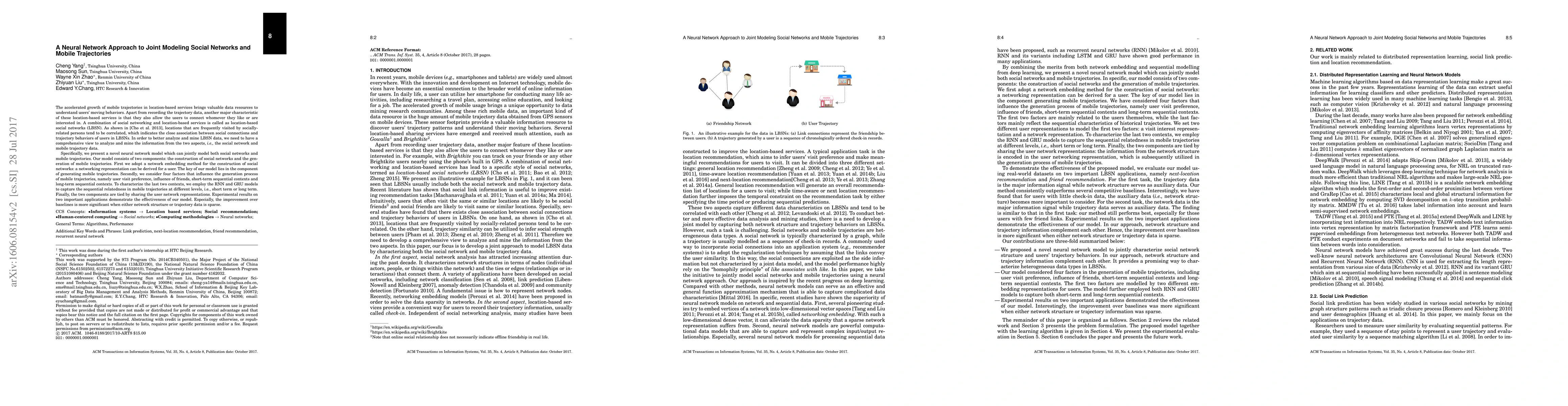 This paper proposes a neural network model for jointly modeling social networks and mobile trajectories in location-based social networks (LBSN). The model integrates network embedding for social network construction and RNN/GRU for trajectory generation, considering factors like user preferences and friend influence. Experimental results show significant improvements over baselines, especially in sparse data scenarios.