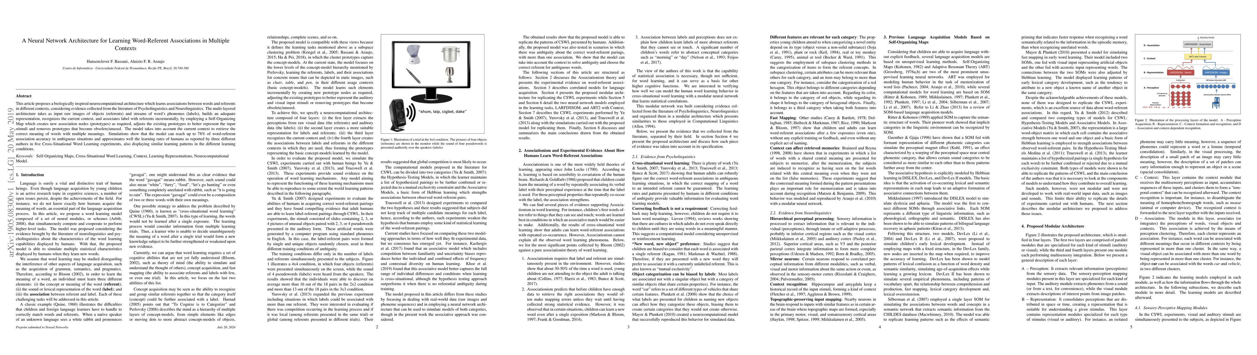 This article proposes a biologically inspired neurocomputational architecture which learns associations between words and referents in different contexts, considering evidence collected from the literature of Psycholinguistics and Neurolinguistics. The multi-layered architecture takes as input raw images of objects (referents) and streams of word's phonemes (labels), builds an adequate representation, recognizes the current context, and associates label with referents incrementally, by employing a Self-Organizing Map which creates new association nodes (prototypes) as required, adjusts the existing prototypes to better represent the input stimuli and removes prototypes that become obsolete/unused. The model takes into account the current context to retrieve the correct meaning of words with multiple meanings. Simulations show that the model can reach up to 78% of word-referent association accuracy in ambiguous situations and approximates well the learning rates of humans as reported by three different authors in five Cross-Situational Word Learning experiments, also displaying similar learning patterns in the different learning conditions.