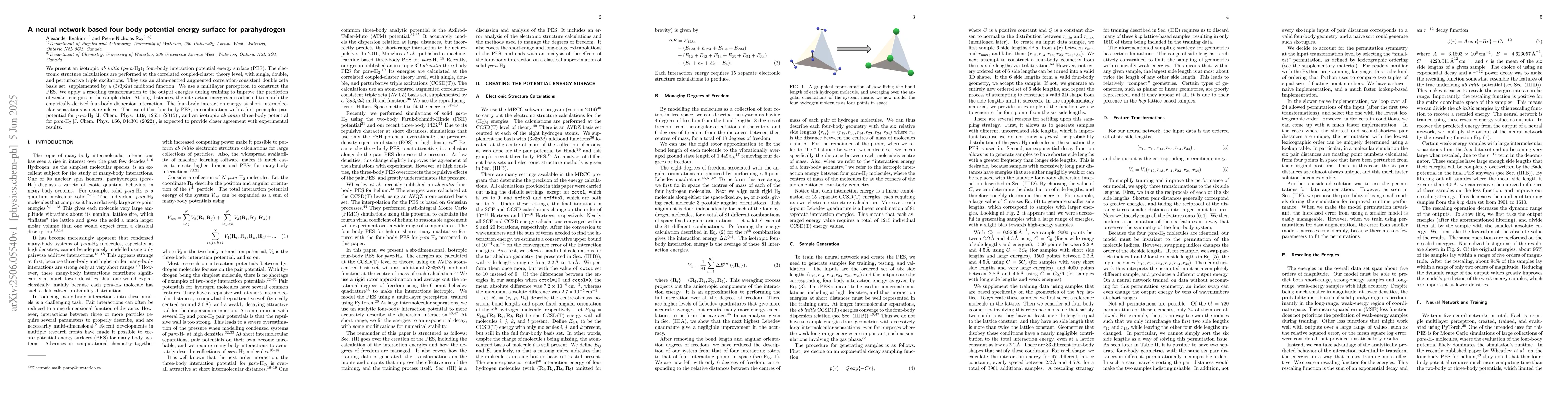 A neural network-based four-body potential energy surface for parahydrogen is presented, combining ab initio electronic structure calculations with machine learning to improve accuracy at long distances.