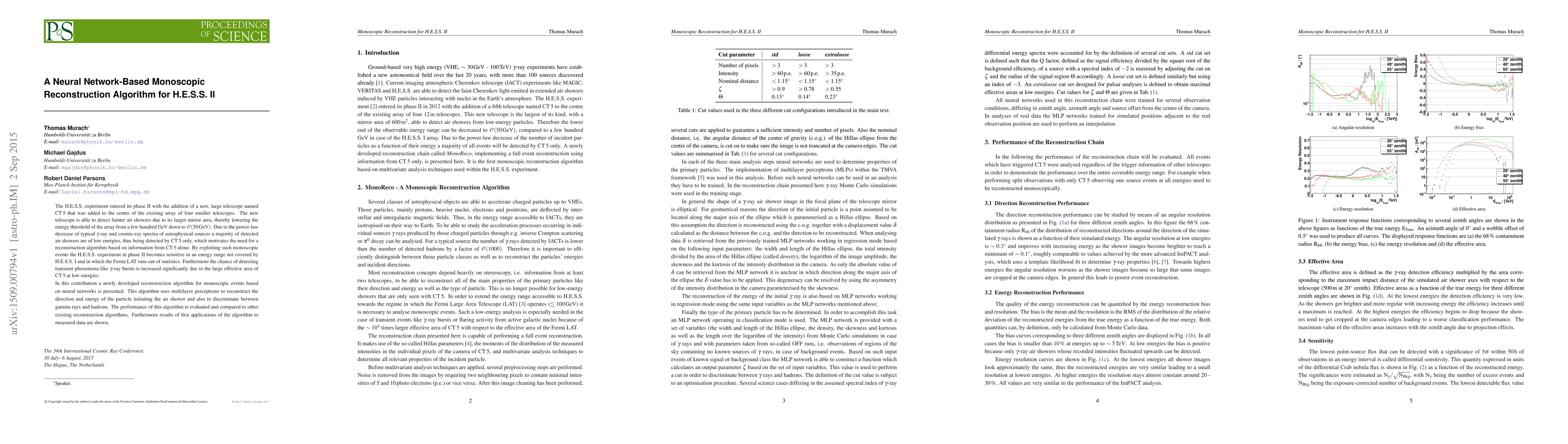 This paper introduces a neural network-based reconstruction algorithm for monoscopic events detected by the new CT 5 telescope in the H.E.S.S. II experiment, enhancing sensitivity to lower energy gamma rays and cosmic rays. The algorithm uses neural networks to reconstruct particle direction and energy, and distinguish between gamma rays and hadrons, showing promising performance compared to existing methods.