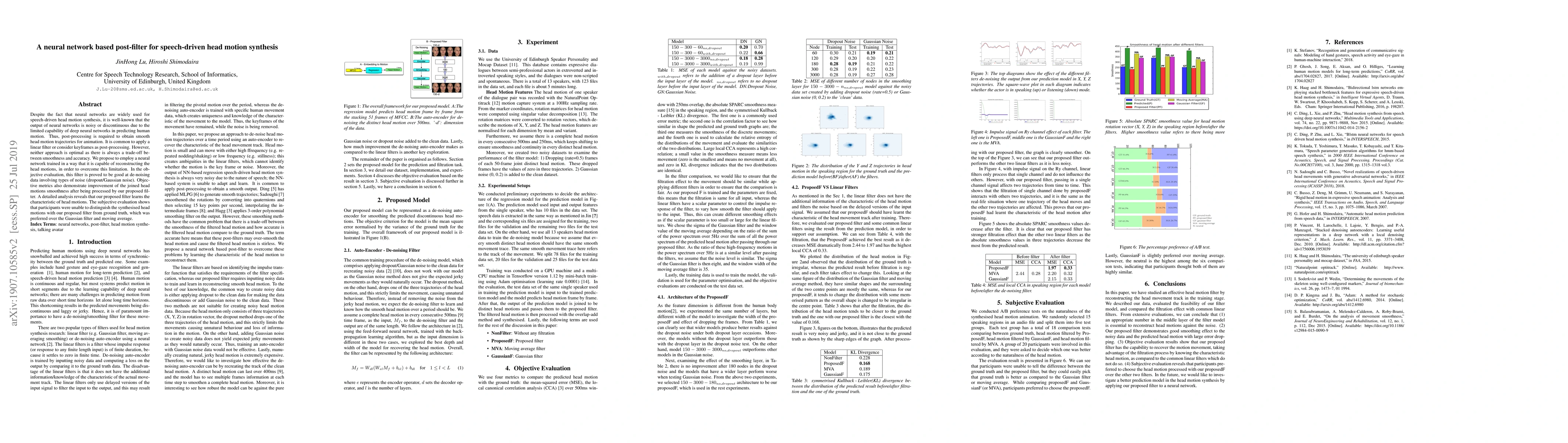 Despite the fact that neural networks are widely used for speech-driven head motion synthesis, it is well-known that the output of neural networks is noisy or discontinuous due to the limited capability of deep neural networks in predicting human motion. Thus, post-processing is required to obtain smooth head motion trajectories for animation. It is common to apply a linear filter or consider keyframes as post-processing. However, neither approach is optimal as there is always a trade-off between smoothness and accuracy. We propose to employ a neural network trained in a way that it is capable of reconstructing the head motions, in order to overcome this limitation. In the objective evaluation, this filter is proved to be good at de-noising data involving types of noise (dropout or Gaussian noise). Objective metrics also demonstrate the improvement of the joined head motion's smoothness after being processed by our proposed filter. A detailed analysis reveals that our proposed filter learns the characteristic of head motions. The subjective evaluation shows that participants were unable to distinguish the synthesised head motions with our proposed filter from ground truth, which was preferred over the Gaussian filter and moving average.
