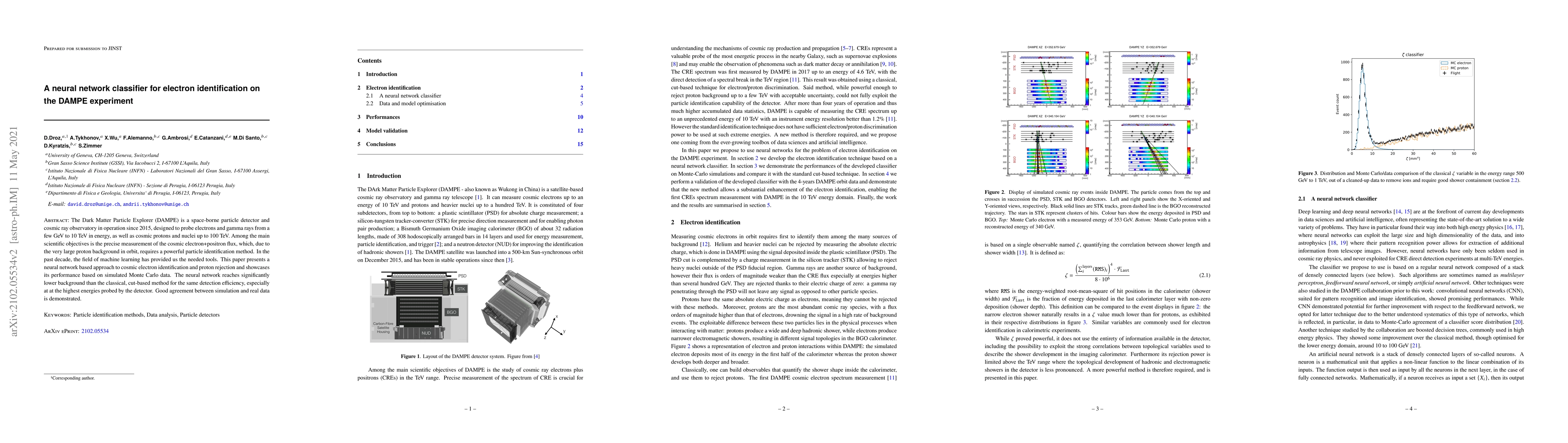 This paper introduces a neural network classifier for electron identification in the DAMPE experiment, achieving significantly lower proton background rejection compared to traditional methods, while maintaining high detection efficiency, especially at high energies. The method's performance is validated through simulated Monte Carlo data and shows good agreement with real data.