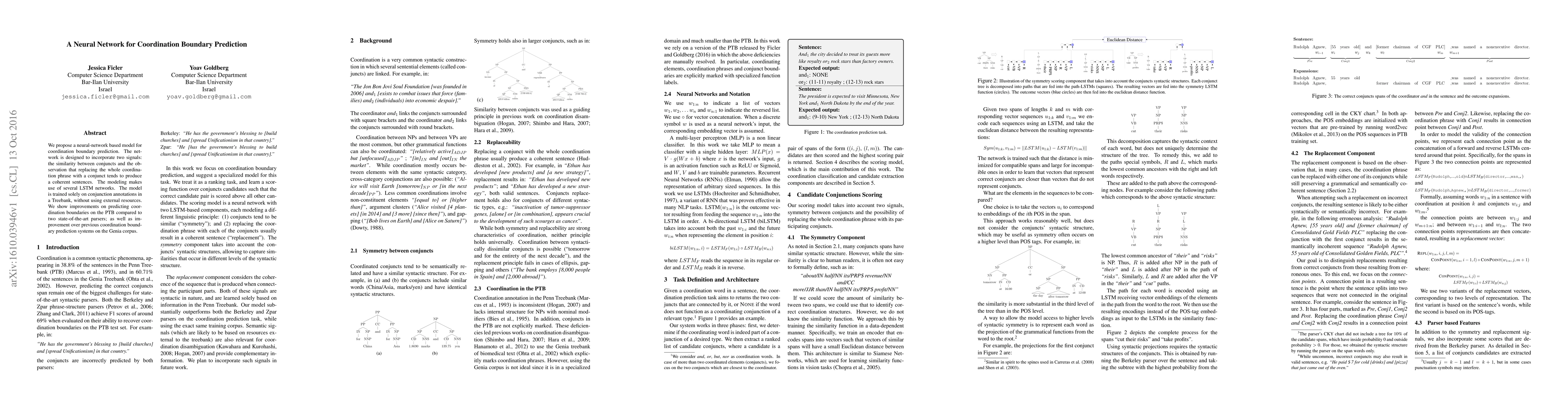 This paper introduces a neural network model for predicting coordination boundaries using LSTM networks, trained on Treebank annotations. The model outperforms existing parsers and systems on both PTB and Genia corpora.