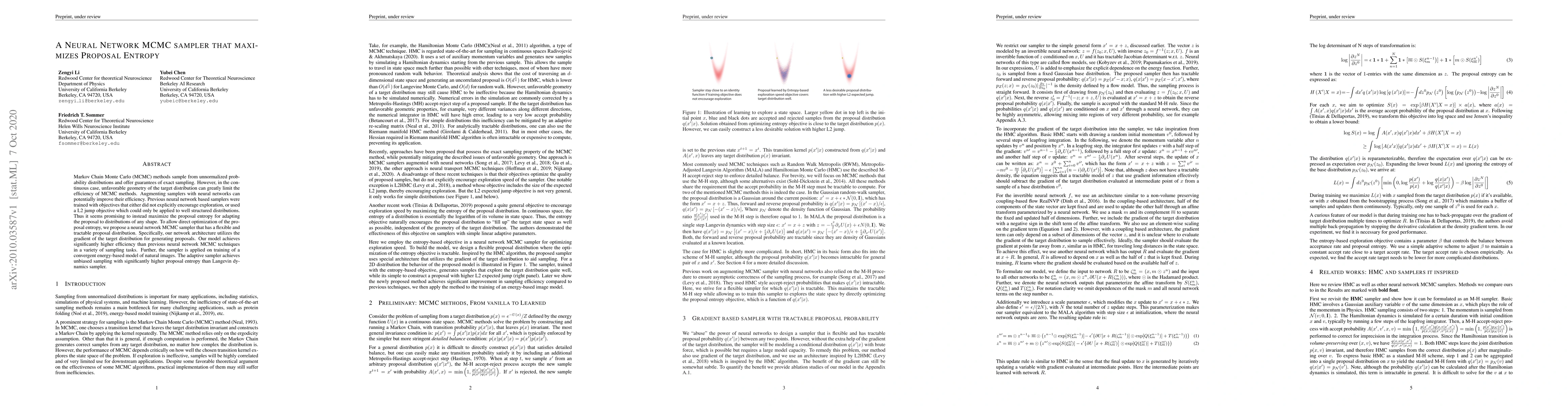 This paper proposes a neural network-augmented MCMC sampler that maximizes proposal entropy to improve sampling efficiency for complex, continuous distributions. The model uses the gradient of the target distribution to generate proposals, achieving higher efficiency and higher proposal entropy compared to traditional methods.