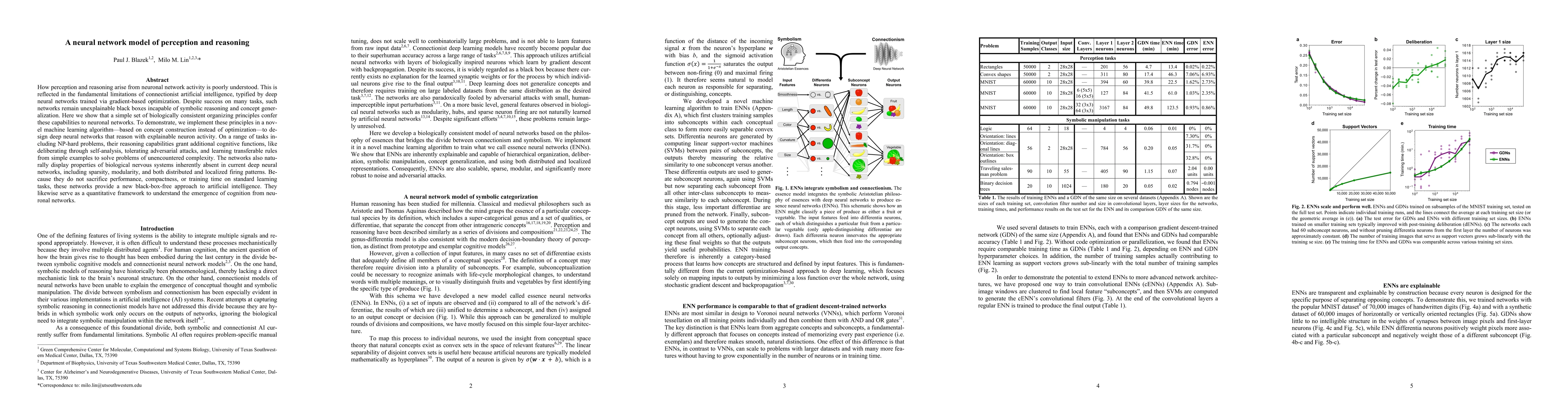 How perception and reasoning arise from neuronal network activity is poorly understood. This is reflected in the fundamental limitations of connectionist artificial intelligence, typified by deep neural networks trained via gradient-based optimization. Despite success on many tasks, such networks remain unexplainable black boxes incapable of symbolic reasoning and concept generalization. Here we show that a simple set of biologically consistent organizing principles confer these capabilities to neuronal networks. To demonstrate, we implement these principles in a novel machine learning algorithm, based on concept construction instead of optimization, to design deep neural networks that reason with explainable neuron activity. On a range of tasks including NP-hard problems, their reasoning capabilities grant additional cognitive functions, like deliberating through self-analysis, tolerating adversarial attacks, and learning transferable rules from simple examples to solve problems of unencountered complexity. The networks also naturally display properties of biological nervous systems inherently absent in current deep neural networks, including sparsity, modularity, and both distributed and localized firing patterns. Because they do not sacrifice performance, compactness, or training time on standard learning tasks, these networks provide a new black-box-free approach to artificial intelligence. They likewise serve as a quantitative framework to understand the emergence of cognition from neuronal networks.