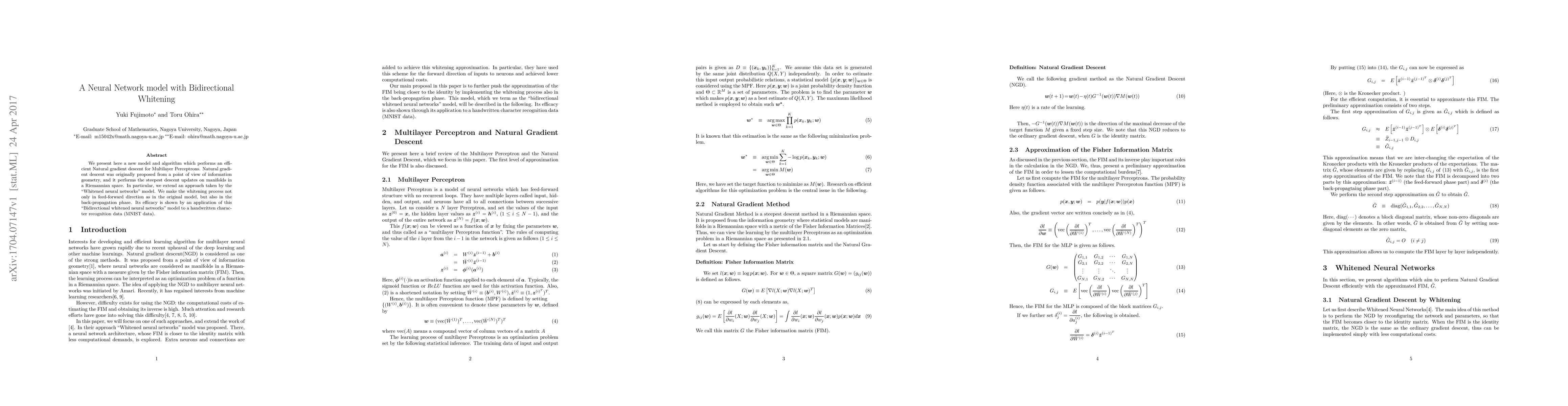 We present here a new model and algorithm which performs an efficient Natural gradient descent for Multilayer Perceptrons. Natural gradient descent was originally proposed from a point of view of information geometry, and it performs the steepest descent updates on manifolds in a Riemannian space. In particular, we extend an approach taken by the "Whitened neural networks" model. We make the whitening process not only in feed-forward direction as in the original model, but also in the back-propagation phase. Its efficacy is shown by an application of this "Bidirectional whitened neural networks" model to a handwritten character recognition data (MNIST data).
