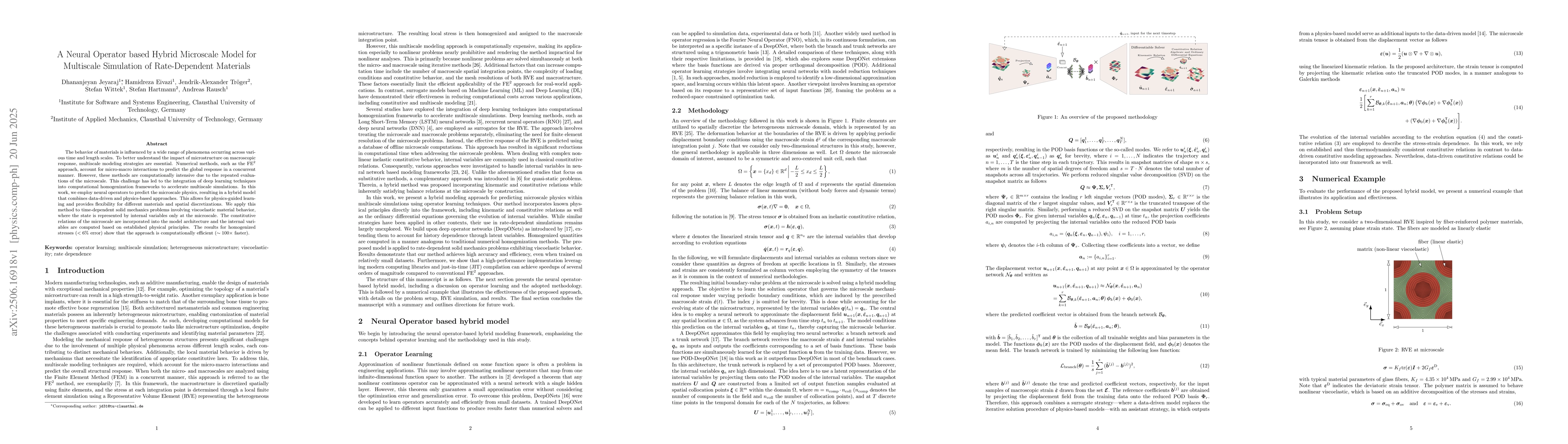 The behavior of materials is influenced by a wide range of phenomena occurring across various time and length scales. To better understand the impact of microstructure on macroscopic response, multiscale modeling strategies are essential. Numerical methods, such as the $\text{FE}^2$ approach, account for micro-macro interactions to predict the global response in a concurrent manner. However, these methods are computationally intensive due to the repeated evaluations of the microscale. This challenge has led to the integration of deep learning techniques into computational homogenization frameworks to accelerate multiscale simulations. In this work, we employ neural operators to predict the microscale physics, resulting in a hybrid model that combines data-driven and physics-based approaches. This allows for physics-guided learning and provides flexibility for different materials and spatial discretizations. We apply this method to time-dependent solid mechanics problems involving viscoelastic material behavior, where the state is represented by internal variables only at the microscale. The constitutive relations of the microscale are incorporated into the model architecture and the internal variables are computed based on established physical principles. The results for homogenized stresses ($<6\%$ error) show that the approach is computationally efficient ($\sim 100 \times$ faster).