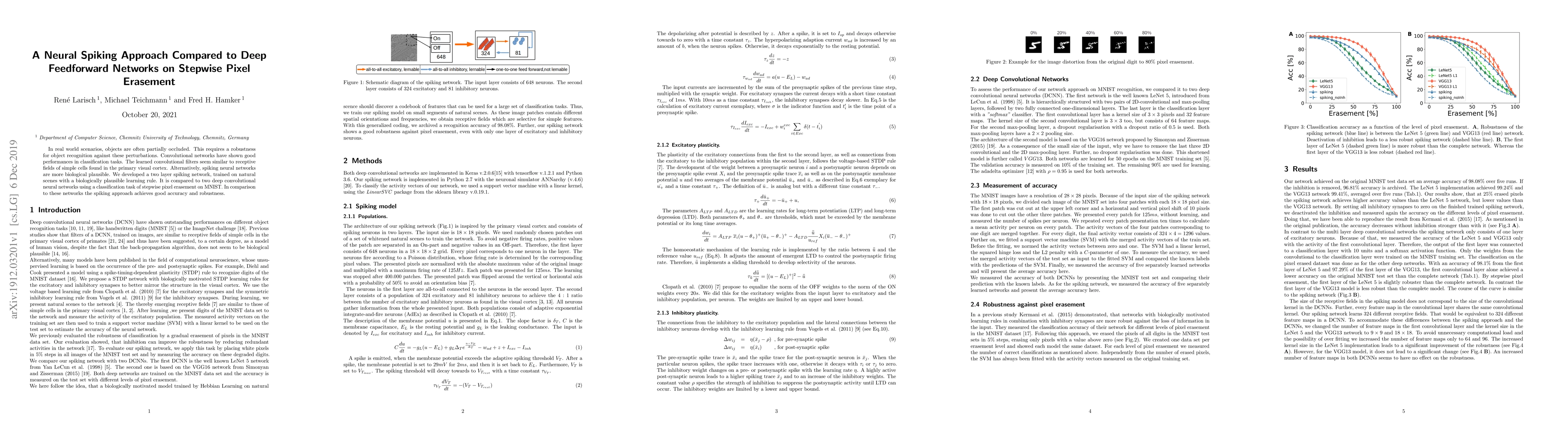 The paper developed a two-layer spiking neural network trained on natural scenes using a biologically plausible learning rule. It was compared to two deep convolutional neural networks (LeNet5 and VGG13) on a classification task of stepwise pixel erasure on MNIST.