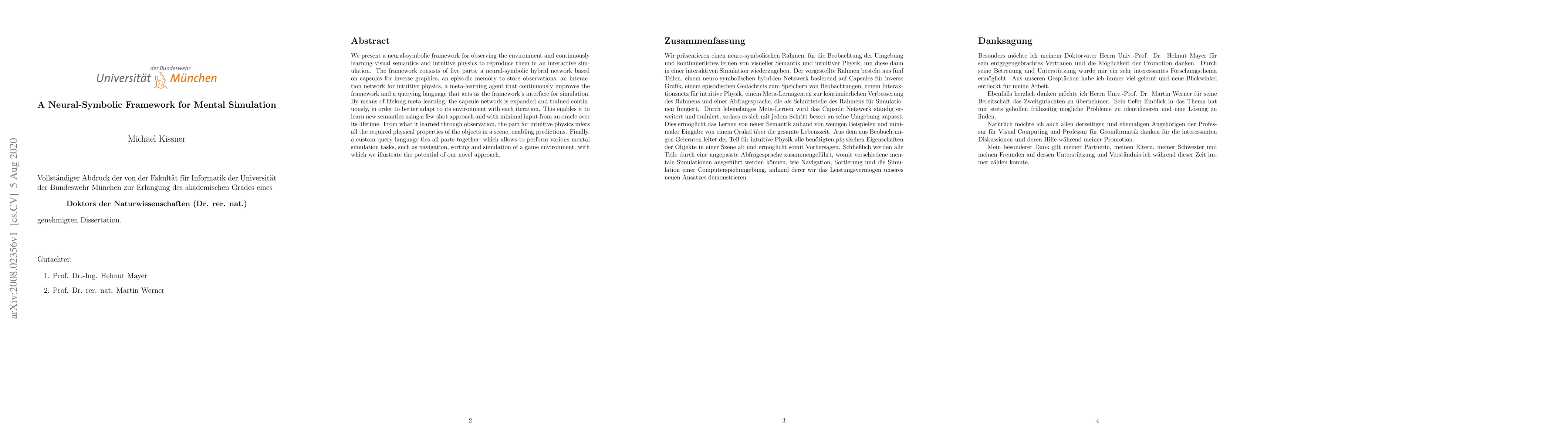 We present a neural-symbolic framework for observing the environment and continuously learning visual semantics and intuitive physics to reproduce them in an interactive simulation. The framework consists of five parts, a neural-symbolic hybrid network based on capsules for inverse graphics, an episodic memory to store observations, an interaction network for intuitive physics, a meta-learning agent that continuously improves the framework and a querying language that acts as the framework's interface for simulation. By means of lifelong meta-learning, the capsule network is expanded and trained continuously, in order to better adapt to its environment with each iteration. This enables it to learn new semantics using a few-shot approach and with minimal input from an oracle over its lifetime. From what it learned through observation, the part for intuitive physics infers all the required physical properties of the objects in a scene, enabling predictions. Finally, a custom query language ties all parts together, which allows to perform various mental simulation tasks, such as navigation, sorting and simulation of a game environment, with which we illustrate the potential of our novel approach.