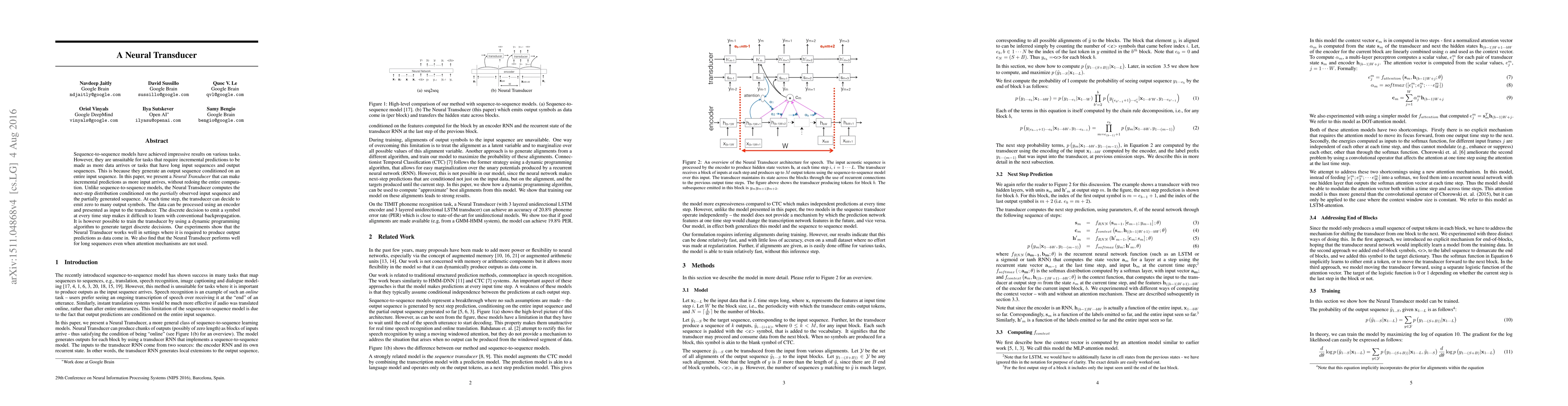 Sequence-to-sequence models have achieved impressive results on various tasks. However, they are unsuitable for tasks that require incremental predictions to be made as more data arrives or tasks that have long input sequences and output sequences. This is because they generate an output sequence conditioned on an entire input sequence. In this paper, we present a Neural Transducer that can make incremental predictions as more input arrives, without redoing the entire computation. Unlike sequence-to-sequence models, the Neural Transducer computes the next-step distribution conditioned on the partially observed input sequence and the partially generated sequence. At each time step, the transducer can decide to emit zero to many output symbols. The data can be processed using an encoder and presented as input to the transducer. The discrete decision to emit a symbol at every time step makes it difficult to learn with conventional backpropagation. It is however possible to train the transducer by using a dynamic programming algorithm to generate target discrete decisions. Our experiments show that the Neural Transducer works well in settings where it is required to produce output predictions as data come in. We also find that the Neural Transducer performs well for long sequences even when attention mechanisms are not used.