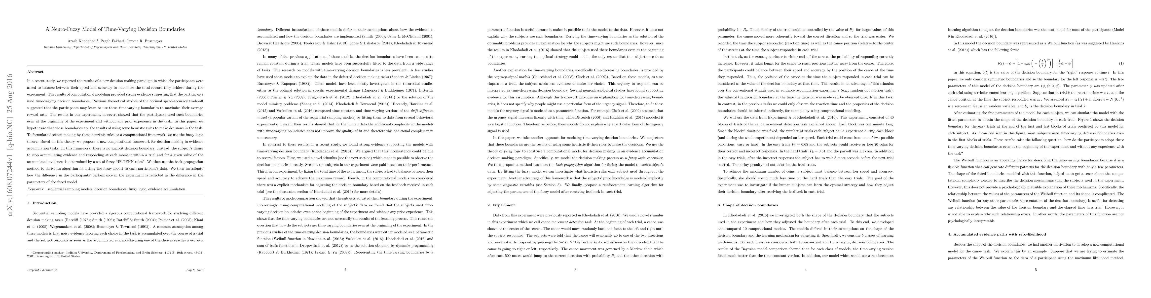 This paper proposes a neuro-fuzzy model to explain time-varying decision boundaries in evidence accumulation tasks, suggesting that participants use heuristic rules determined by fuzzy logic to balance speed and accuracy. The model uses back-propagation to fit the fuzzy "IF-THEN" rules to individual participant data, revealing how performance differences correlate with parameter variations in the model.