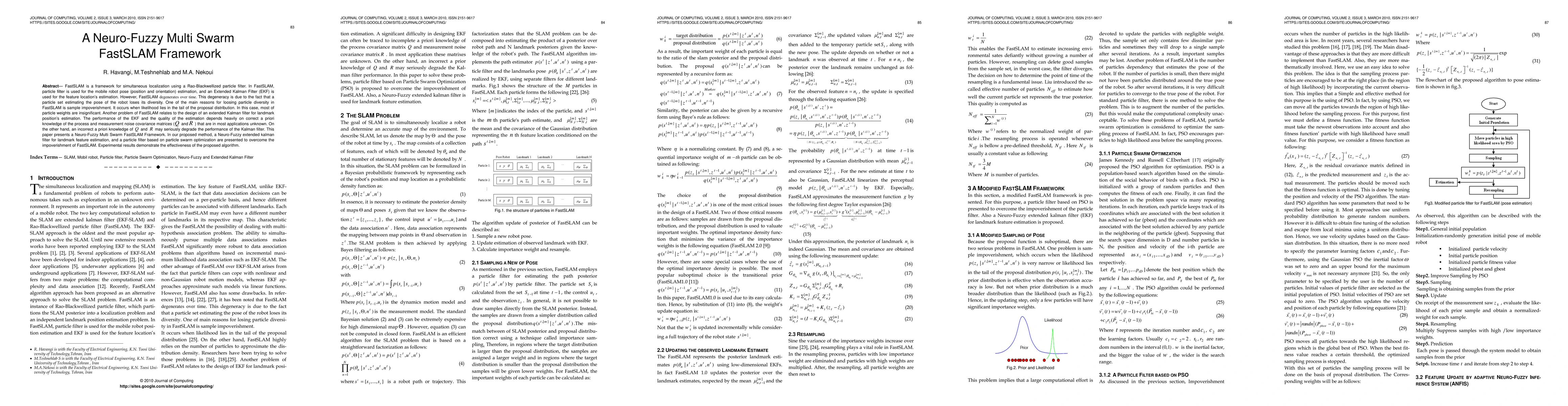 FastSLAM is a framework for simultaneous localization using a Rao-Blackwellized particle filter. In FastSLAM, particle filter is used for the mobile robot pose (position and orientation) estimation, and an Extended Kalman Filter (EKF) is used for the feature location's estimation. However, FastSLAM degenerates over time. This degeneracy is due to the fact that a particle set estimating the pose of the robot loses its diversity. One of the main reasons for loosing particle diversity in FastSLAM is sample impoverishment. It occurs when likelihood lies in the tail of the proposal distribution. In this case, most of particle weights are insignificant. Another problem of FastSLAM relates to the design of an extended Kalman filter for landmark position's estimation. The performance of the EKF and the quality of the estimation depends heavily on correct a priori knowledge of the process and measurement noise covariance matrices (Q and R) that are in most applications unknown. On the other hand, an incorrect a priori knowledge of Q and R may seriously degrade the performance of the Kalman filter. This paper presents a Neuro-Fuzzy Multi Swarm FastSLAM Framework. In our proposed method, a Neuro-Fuzzy extended kalman filter for landmark feature estimation, and a particle filter based on particle swarm optimization are presented to overcome the impoverishment of FastSLAM. Experimental results demonstrate the effectiveness of the proposed algorithm.