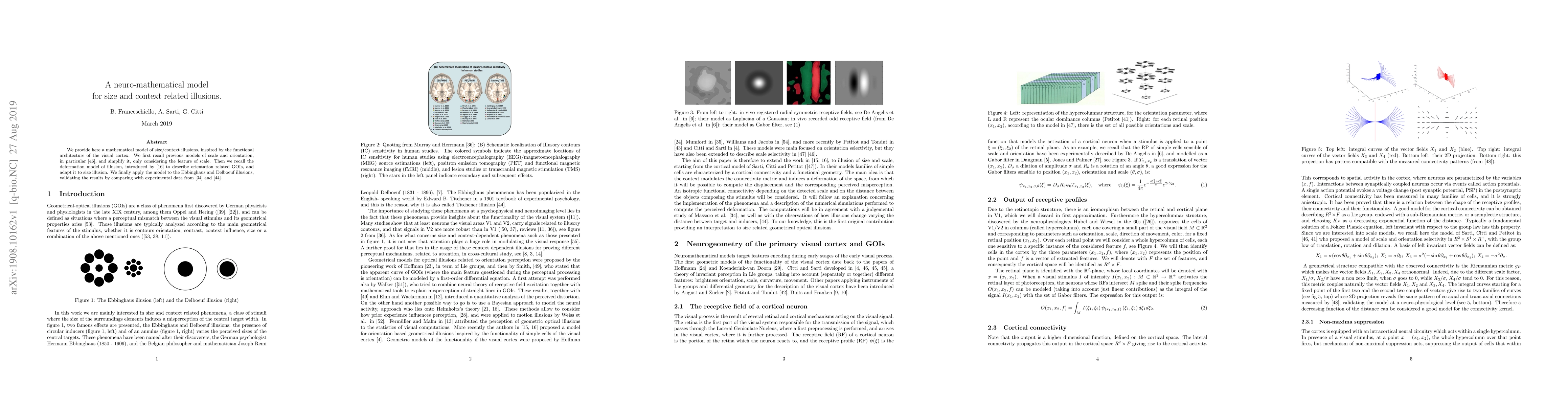 This paper proposes a neuro-mathematical model inspired by visual cortex architecture to explain size and context related illusions, adapting previous models for scale and orientation to describe size illusions and validating the model using experimental data from classic illusions like Ebbinghaus and Delboeuf.
