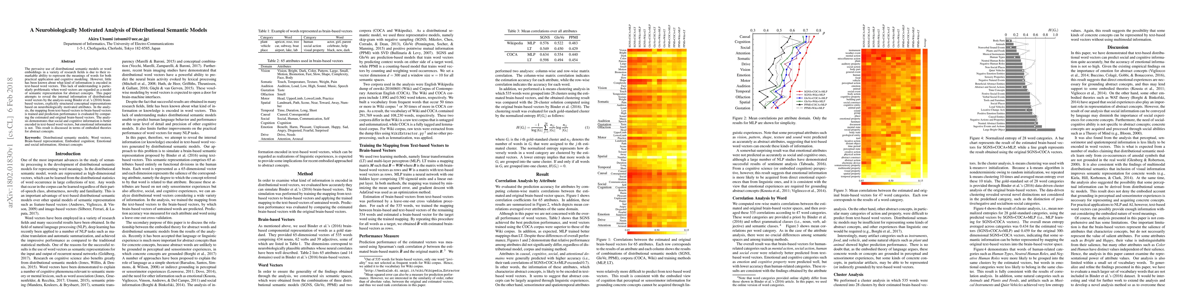 The pervasive use of distributional semantic models or word embeddings in a variety of research fields is due to their remarkable ability to represent the meanings of words for both practical application and cognitive modeling. However, little has been known about what kind of information is encoded in text-based word vectors. This lack of understanding is particularly problematic when word vectors are regarded as a model of semantic representation for abstract concepts. This paper attempts to reveal the internal information of distributional word vectors by the analysis using Binder et al.'s (2016) brain-based vectors, explicitly structured conceptual representations based on neurobiologically motivated attributes. In the analysis, the mapping from text-based vectors to brain-based vectors is trained and prediction performance is evaluated by comparing the estimated and original brain-based vectors. The analysis demonstrates that social and cognitive information is better encoded in text-based word vectors, but emotional information is not. This result is discussed in terms of embodied theories for abstract concepts.