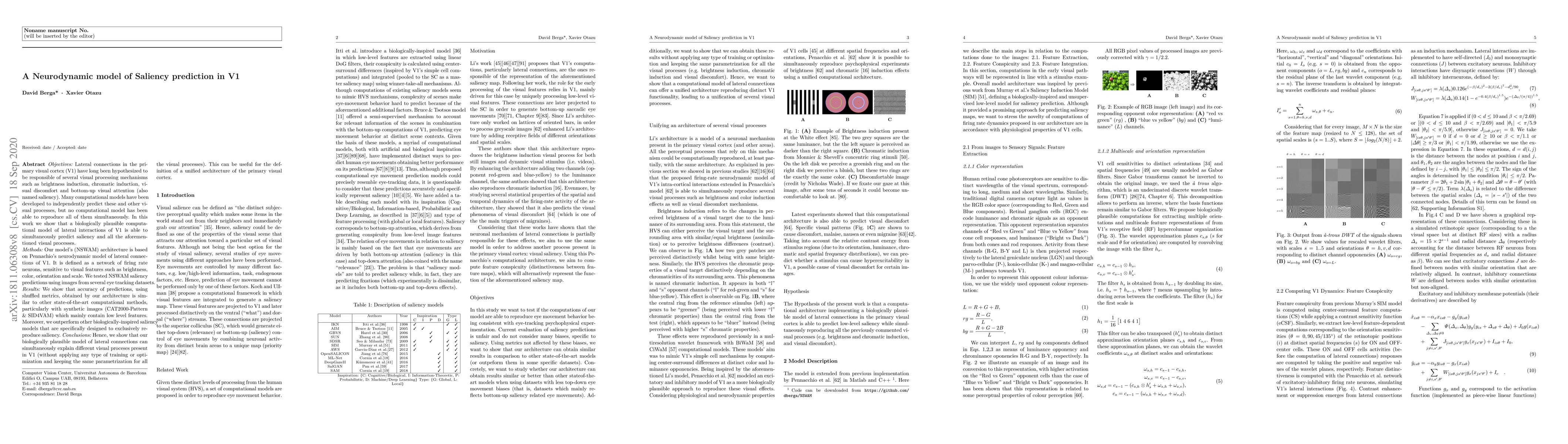 This paper presents a neurodynamic model (NSWAM) of lateral interactions in V1 that can simultaneously predict saliency and other visual processes like brightness and chromatic induction, without training. The model's performance is comparable to state-of-the-art methods on saliency prediction, especially for synthetic images.