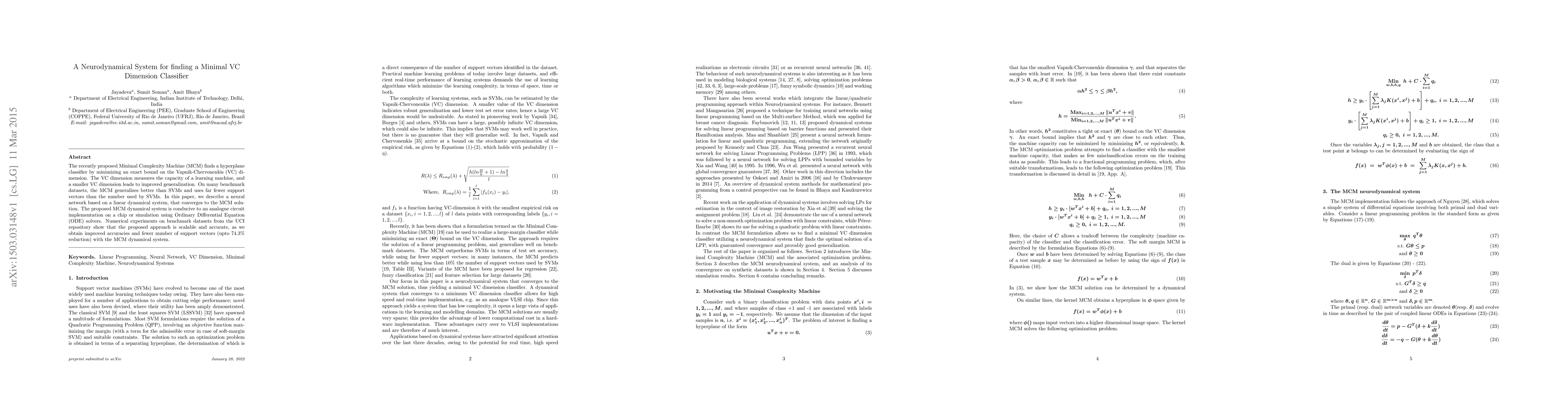 The recently proposed Minimal Complexity Machine (MCM) finds a hyperplane classifier by minimizing an exact bound on the Vapnik-Chervonenkis (VC) dimension. The VC dimension measures the capacity of a learning machine, and a smaller VC dimension leads to improved generalization. On many benchmark datasets, the MCM generalizes better than SVMs and uses far fewer support vectors than the number used by SVMs. In this paper, we describe a neural network based on a linear dynamical system, that converges to the MCM solution. The proposed MCM dynamical system is conducive to an analogue circuit implementation on a chip or simulation using Ordinary Differential Equation (ODE) solvers. Numerical experiments on benchmark datasets from the UCI repository show that the proposed approach is scalable and accurate, as we obtain improved accuracies and fewer number of support vectors (upto 74.3% reduction) with the MCM dynamical system.