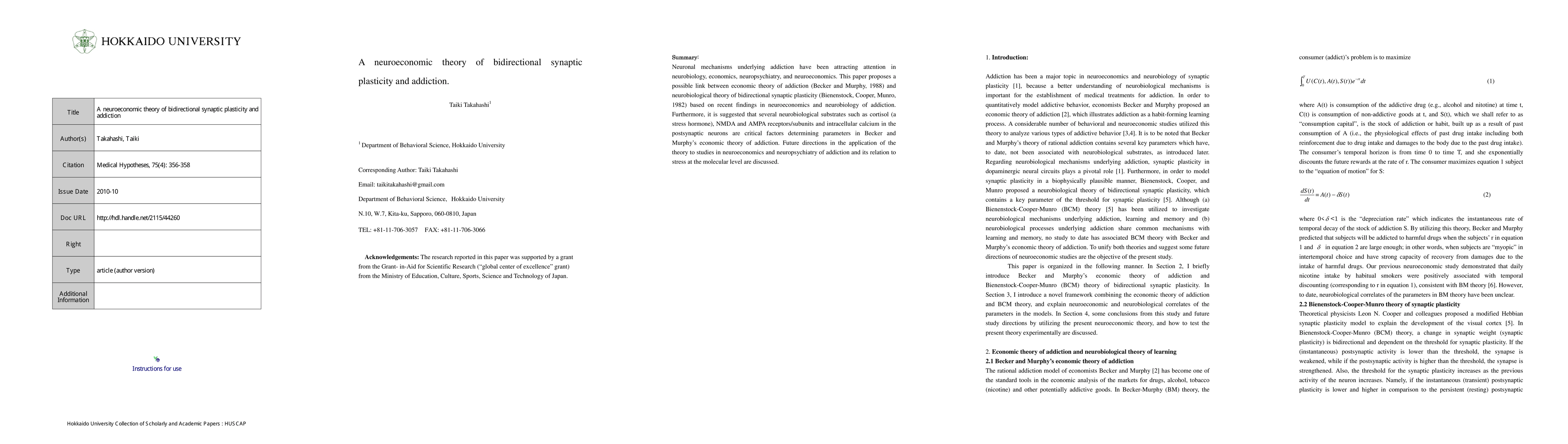 This paper proposes a link between economic theory of addiction and neurobiological theory of bidirectional synaptic plasticity, suggesting that stress hormones like cortisol play a crucial role in addiction.