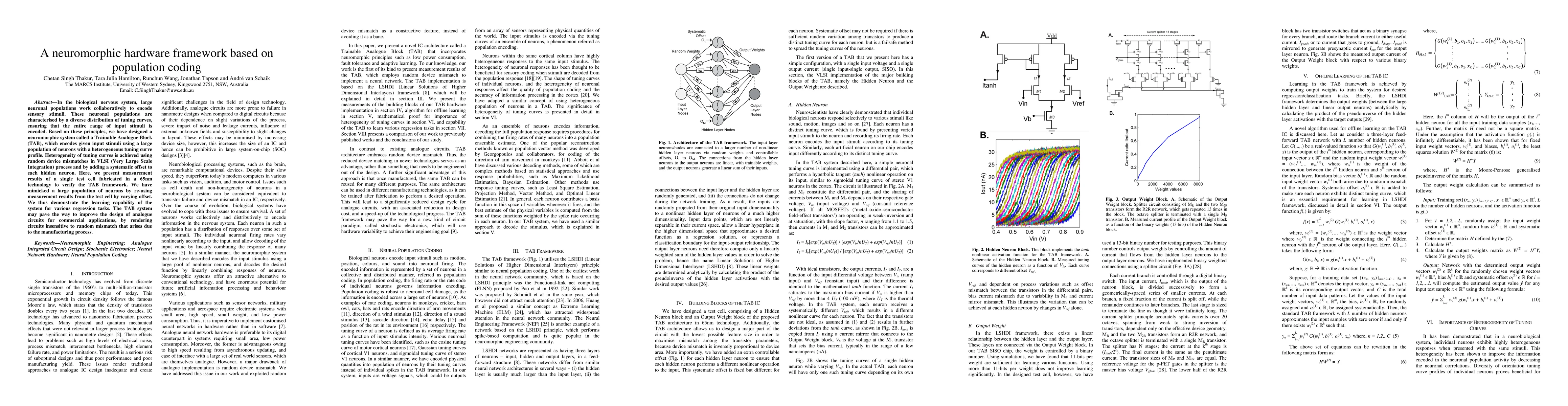 In the biological nervous system, large neuronal populations work collaboratively to encode sensory stimuli. These neuronal populations are characterised by a diverse distribution of tuning curves, ensuring that the entire range of input stimuli is encoded. Based on these principles, we have designed a neuromorphic system called a Trainable Analogue Block (TAB), which encodes given input stimuli using a large population of neurons with a heterogeneous tuning curve profile. Heterogeneity of tuning curves is achieved using random device mismatches in VLSI (Very Large Scale Integration) process and by adding a systematic offset to each hidden neuron. Here, we present measurement results of a single test cell fabricated in a 65nm technology to verify the TAB framework. We have mimicked a large population of neurons by re-using measurement results from the test cell by varying offset. We thus demonstrate the learning capability of the system for various regression tasks. The TAB system may pave the way to improve the design of analogue circuits for commercial applications, by rendering circuits insensitive to random mismatch that arises due to the manufacturing process.