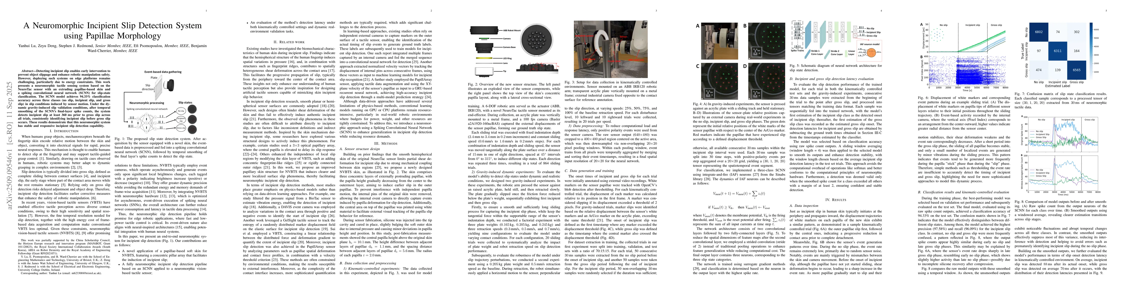 Detecting incipient slip enables early intervention to prevent object slippage and enhance robotic manipulation safety. However, deploying such systems on edge platforms remains challenging, particularly due to energy constraints. This work presents a neuromorphic tactile sensing system based on the NeuroTac sensor with an extruding papillae-based skin and a spiking convolutional neural network (SCNN) for slip-state classification. The SCNN model achieves 94.33% classification accuracy across three classes (no slip, incipient slip, and gross slip) in slip conditions induced by sensor motion. Under the dynamic gravity-induced slip validation conditions, after temporal smoothing of the SCNN's final-layer spike counts, the system detects incipient slip at least 360 ms prior to gross slip across all trials, consistently identifying incipient slip before gross slip occurs. These results demonstrate that this neuromorphic system has stable and responsive incipient slip detection capability.