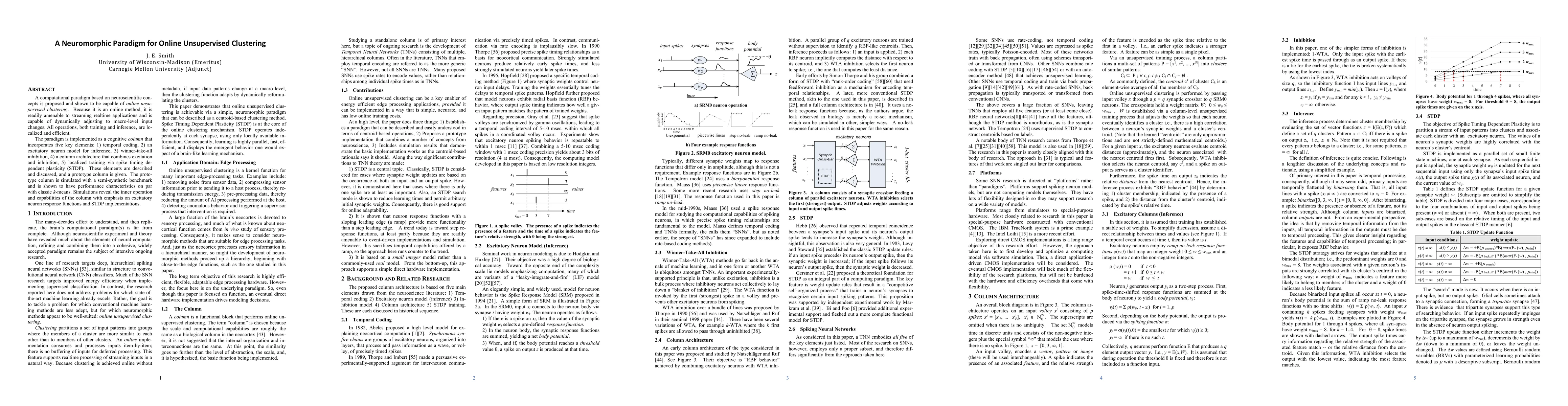 A computational paradigm based on neuroscientific concepts is proposed and shown to be capable of online unsupervised clustering. Because it is an online method, it is readily amenable to streaming realtime applications and is capable of dynamically adjusting to macro-level input changes. All operations, both training and inference, are localized and efficient. The paradigm is implemented as a cognitive column that incorporates five key elements: 1) temporal coding, 2) an excitatory neuron model for inference, 3) winner-take-all inhibition, 4) a column architecture that combines excitation and inhibition, 5) localized training via spike timing de-pendent plasticity (STDP). These elements are described and discussed, and a prototype column is given. The prototype column is simulated with a semi-synthetic benchmark and is shown to have performance characteristics on par with classic k-means. Simulations reveal the inner operation and capabilities of the column with emphasis on excitatory neuron response functions and STDP implementations.