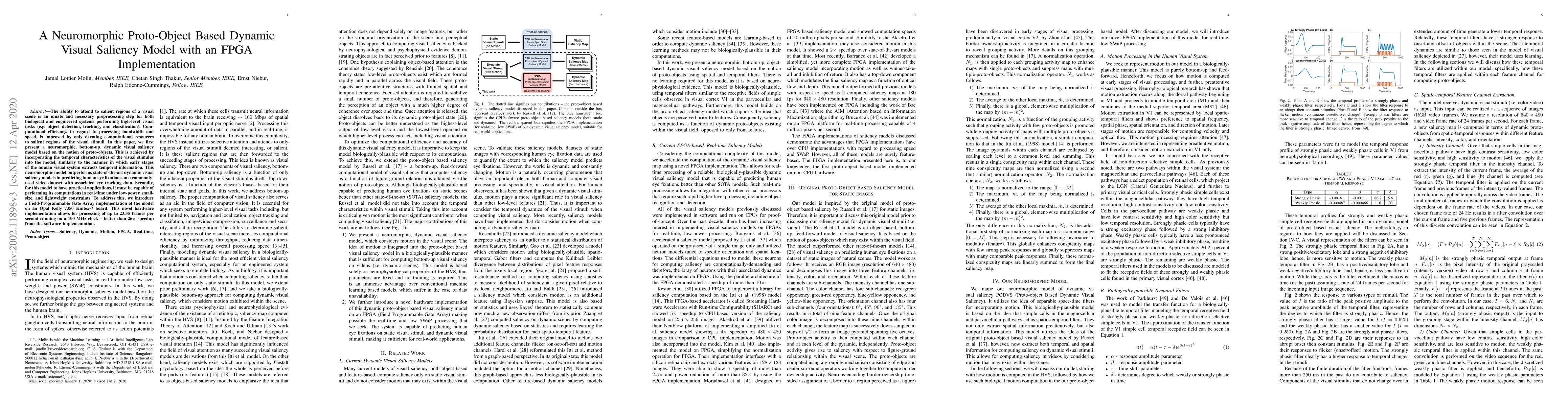 This paper proposes a neuromorphic dynamic visual saliency model based on proto-objects, which outperforms existing models in predicting human eye fixations. It also presents an FPGA implementation on a Kintex-7 board, achieving a 26x speedup and real-time processing at 23.35 frames per second.