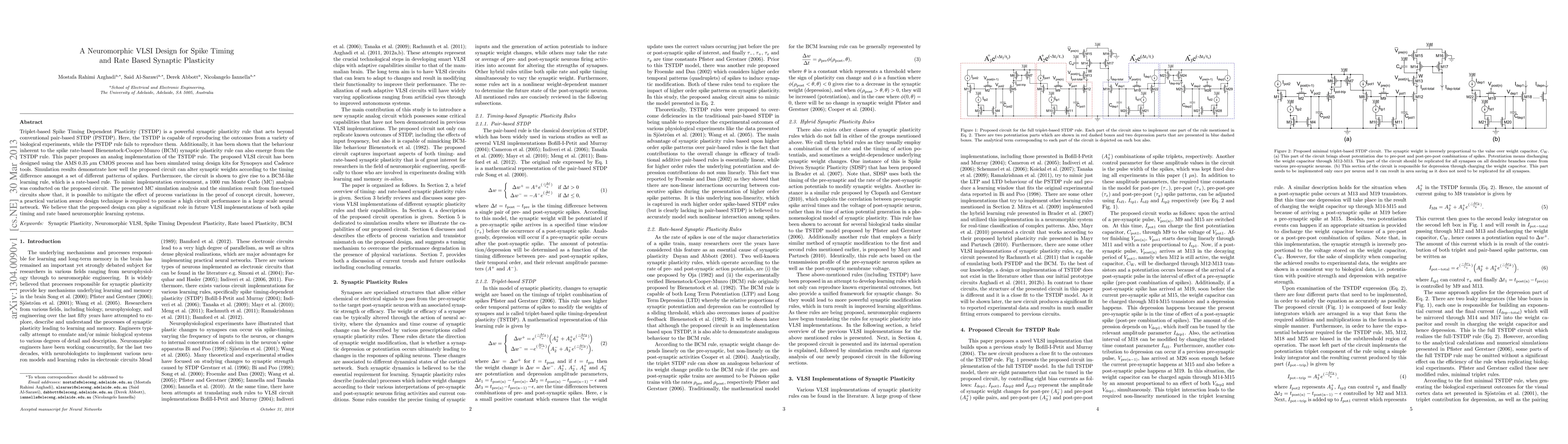 This paper proposes an analog VLSI circuit for implementing Triplet-based Spike Timing Dependent Plasticity (TSTDP), demonstrating its ability to reproduce biological synaptic plasticity outcomes better than pair-based STDP. The circuit, designed in AMS 0.35 um CMOS, also exhibits a rate-based BCM learning rule, and a Monte Carlo analysis suggests potential for mitigating process variations, though further techniques are needed for large-scale neural networks.