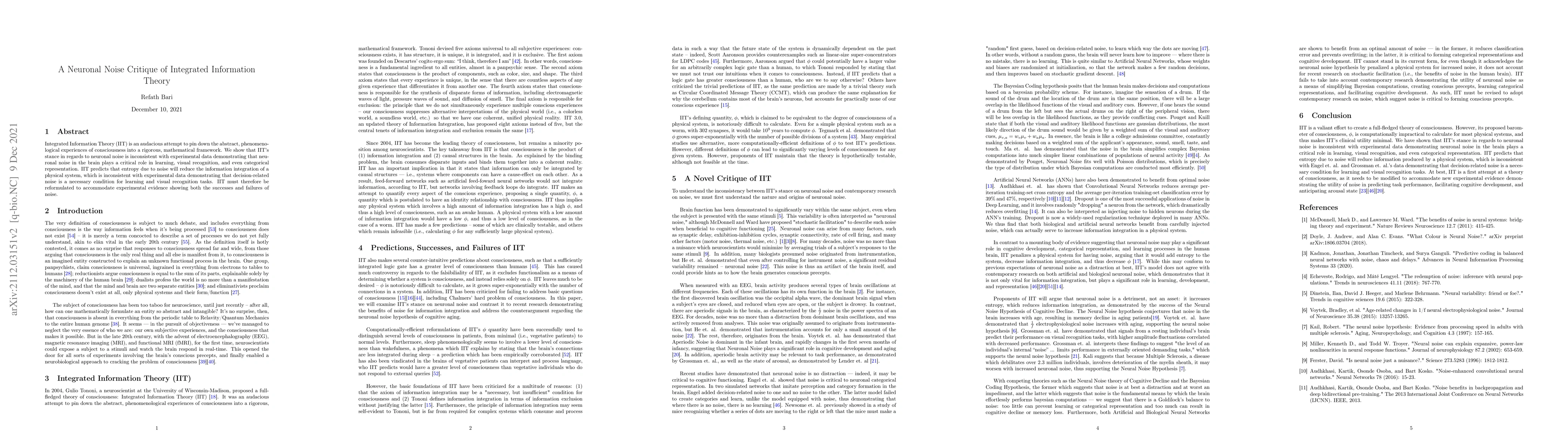 Integrated Information Theory (IIT) is an audacious attempt to pin down the abstract, phenomenological experiences of consciousness into a rigorous, mathematical framework. We show that IIT's stance in regards to neuronal noise is inconsistent with experimental data demonstrating that neuronal noise in the brain plays a critical role in learning, visual recognition, and even categorical representation. IIT predicts that entropy due to noise will reduce the information integration of a physical system, which is inconsistent with experimental data demonstrating that decision-related noise is a necessary condition for learning and visual recognition tasks. IIT must therefore be reformulated to accommodate experimental evidence showing both the successes and failures of noise.