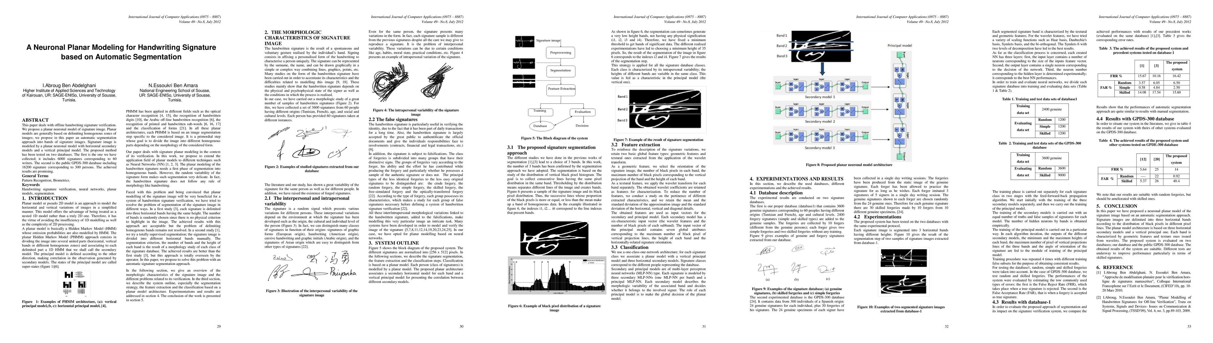 This paper deals with offline handwriting signature verification.We propose a planar neuronal model of signature image. Planarmodelsare generally based on delimiting homogenous zones ofimages; we propose in this paper an automatic segmentationapproach into bands of signature images. Signature image ismodeled by a planar neuronal model with horizontal secondarymodels and a verticalprincipal model. The proposed methodhas been tested on two databases. The first is the one we havecollected; it includes 6000 signaturescorresponding to 60writers. The second is the public GPDS-300 database including16200 signature corresponding to 300 persons. The achievedresults are promising.
