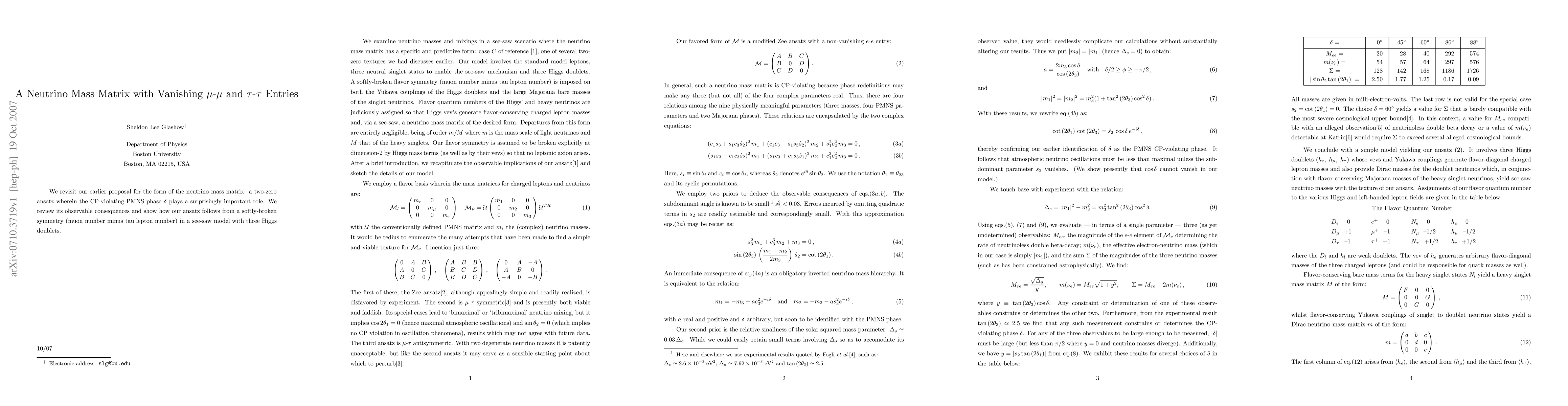 We revisit our earlier proposal for the form of the neutrino mass matrix: a two-zero ansatz wherein the CP-violating PMNS phase $\delta$ plays a surprisingly important role. We review its observable consequences and show how our ansatz follows from a softly-broken symmetry (muon number minus tau lepton number) in a see-saw model with three Higgs doublets.