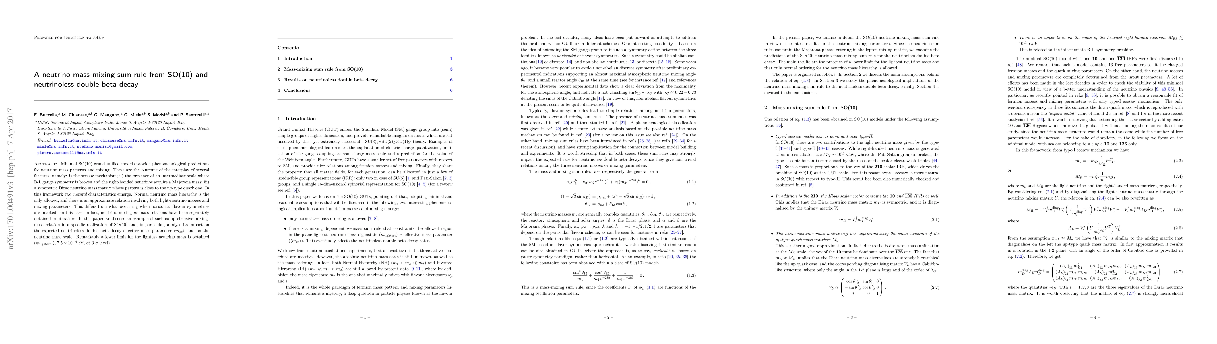 Minimal SO(10) grand unified models provide phenomenological predictions for neutrino mass patterns and mixing. These are the outcome of the interplay of several features, namely: i) the seesaw mechanism; ii) the presence of an intermediate scale where B-L gauge symmetry is broken and the right-handed neutrinos acquire a Majorana mass; iii) a symmetric Dirac neutrino mass matrix whose pattern is close to the up-type quark one. In this framework two natural characteristics emerge. Normal neutrino mass hierarchy is the only allowed, and there is an approximate relation involving both light-neutrino masses and mixing parameters. This differs from what occurring when horizontal flavour symmetries are invoked. In this case, in fact, neutrino mixing or mass relations have been separately obtained in literature. In this paper we discuss an example of such comprehensive mixing-mass relation in a specific realization of SO(10) and, in particular, analyse its impact on the expected neutrinoless double beta decay effective mass parameter $\langle m_{ee} \rangle$, and on the neutrino mass scale. Remarkably a lower limit for the lightest neutrino mass is obtained ($m_{\rm lightest} \gtrsim 7.5 \times 10^{-4}$ eV, at 3 $\sigma$ level).
