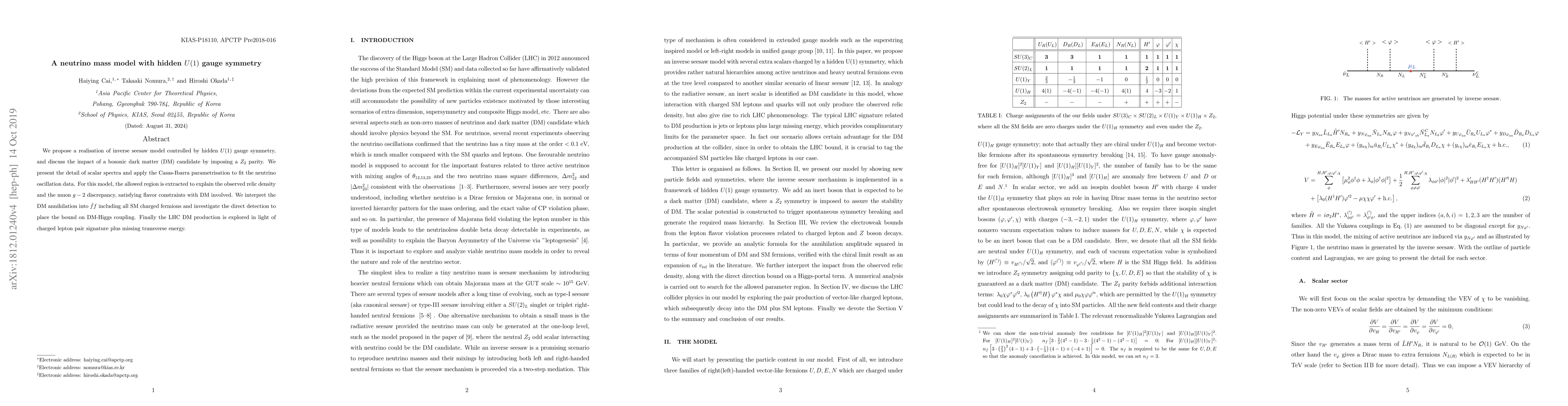 This paper proposes an inverse seesaw neutrino mass model governed by hidden $U(1)$ gauge symmetry and introduces a bosonic dark matter candidate under $Z_2$ parity. It fits the model to neutrino oscillation data and explores its implications for dark matter, including its annihilation, direct detection, and production at the LHC.