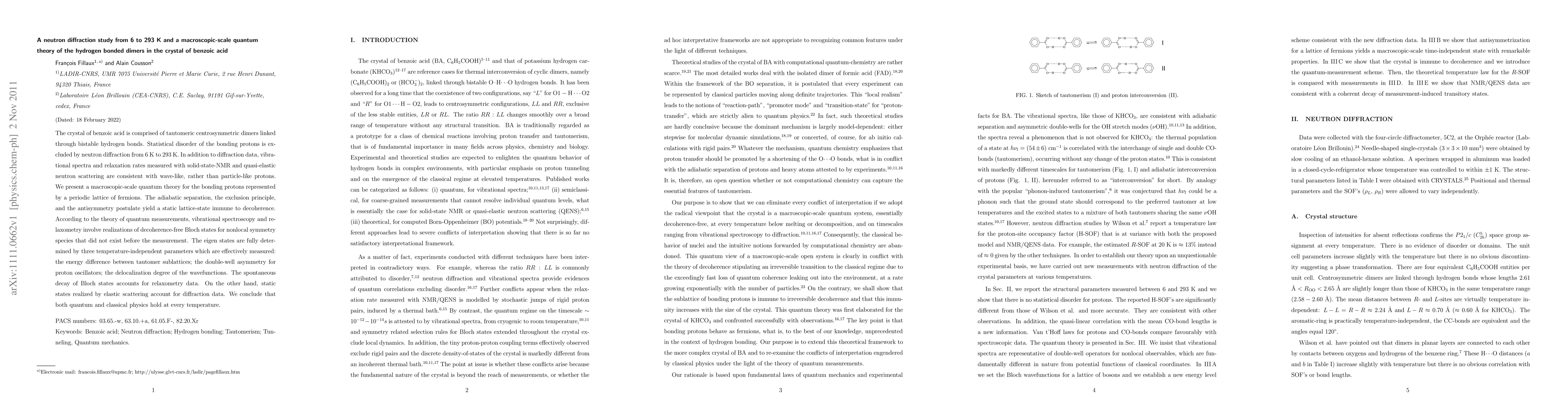The crystal of benzoic acid is comprised of tautomeric centrosymmetric dimers linked through bistable hydrogen bonds. Statistical disorder of the bonding protons is excluded by neutron diffraction from 6 K to 293 K. In addition to diffraction data, vibrational spectra and relaxation rates measured with solid-state-NMR and quasi-elastic neutron scattering are consistent with wave-like, rather than particle-like protons. We present a macroscopic-scale quantum theory for the bonding protons represented by a periodic lattice of fermions. The adiabatic separation, the exclusion principle, and the antisymmetry postulate yield a static lattice-state immune to decoherence. According to the theory of quantum measurements, vibrational spectroscopy and relaxometry involve realizations of decoherence-free Bloch states for nonlocal symmetry species that did not exist before the measurement. The eigen states are fully determined by three temperature-independent parameters which are effectively measured: the energy difference between tautomer sublattices; the double-well asymmetry for proton oscillators; the delocalization degree of the wavefunctions. The spontaneous decay of Bloch states accounts for relaxometry data. On the other hand, static states realized by elastic scattering account for diffraction data. We conclude that both quantum and classical physics hold at every temperature.