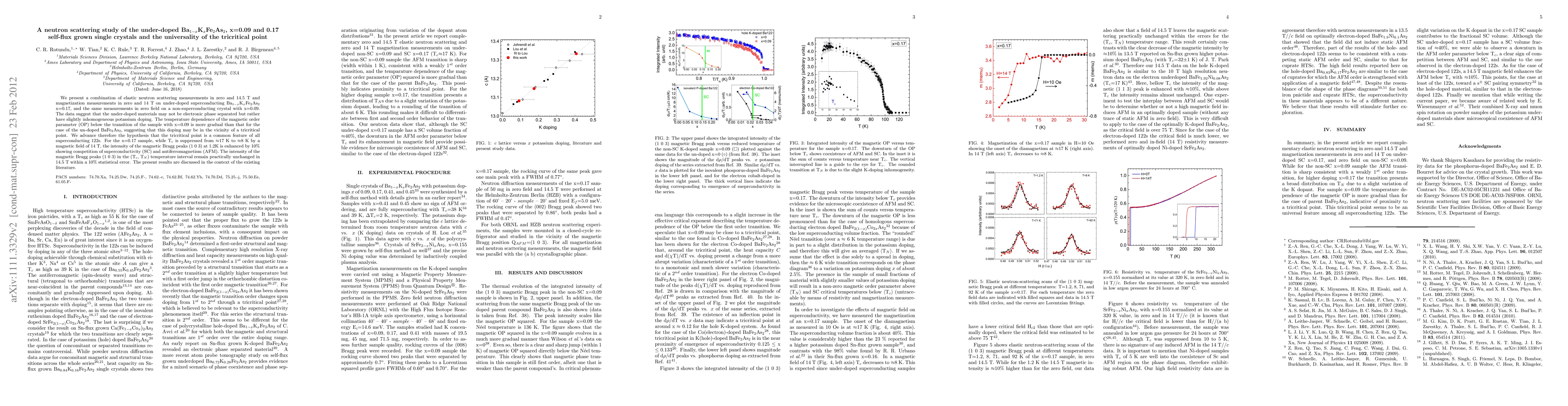 We present a combination of elastic neutron scattering measurements in zero and 14.5 T and magnetization measurements in zero and 14 T on under-doped superconducting Ba$_{1-x}$K$_{x}$Fe$_{2}$As$_{2}$ x=0.17, and the same measurements in zero field on a non-superconducting crystal with x=0.09. The data suggest that the under-doped materials may not be electronic phase separated but rather have slightly inhomogeneous potassium doping. The temperature dependence of the magnetic order parameter (OP) below the transition of the sample with x=0.09 is more gradual than that for the case of the un-doped BaFe$_{2}$As$_{2}$, suggesting that this doping may be in the vicinity of a tricritical point. We advance therefore the hypothesis that the tricritical point is a common feature of all superconducting 122s. For the x=0.17 sample, while T$_{c}$ is suppressed from $\approx$17 K to $\approx$8 K by a magnetic field of 14 T, the intensity of the magnetic Bragg peaks (1 0 3) at 1.2 K is enhanced by 10$%$ showing competition of superconductivity (SC) and antiferromagnetism (AFM). The intensity of the magnetic Bragg peaks (1 0 3) in the (T$_{c}$, T$_{N}$) temperature interval remain practically unchanged in 14.5 T within a 10$%$ statistical error. The present results are discussed in the context of the existing literature.