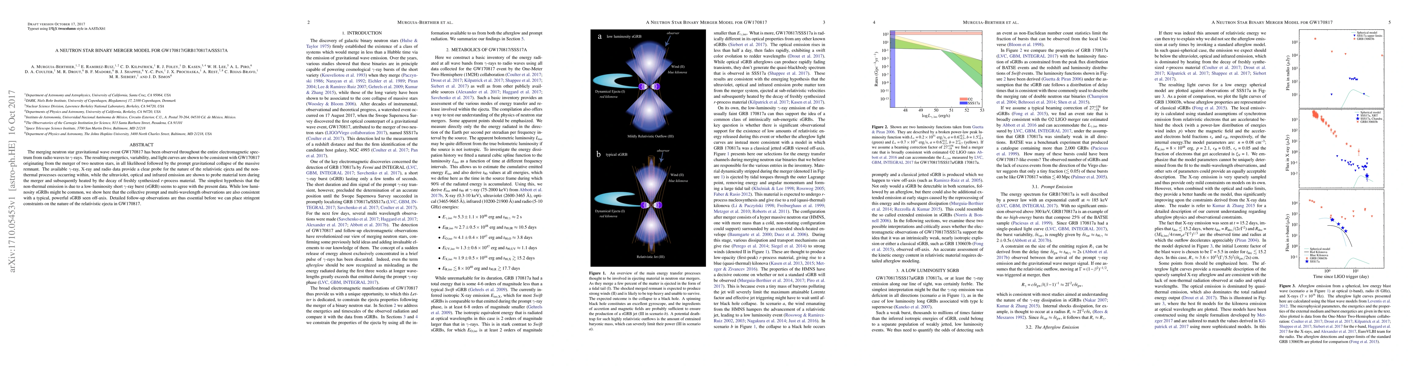 The paper presents a comprehensive neutron star binary merger model for GW170817, integrating multi-wavelength data to explain its observational features.
