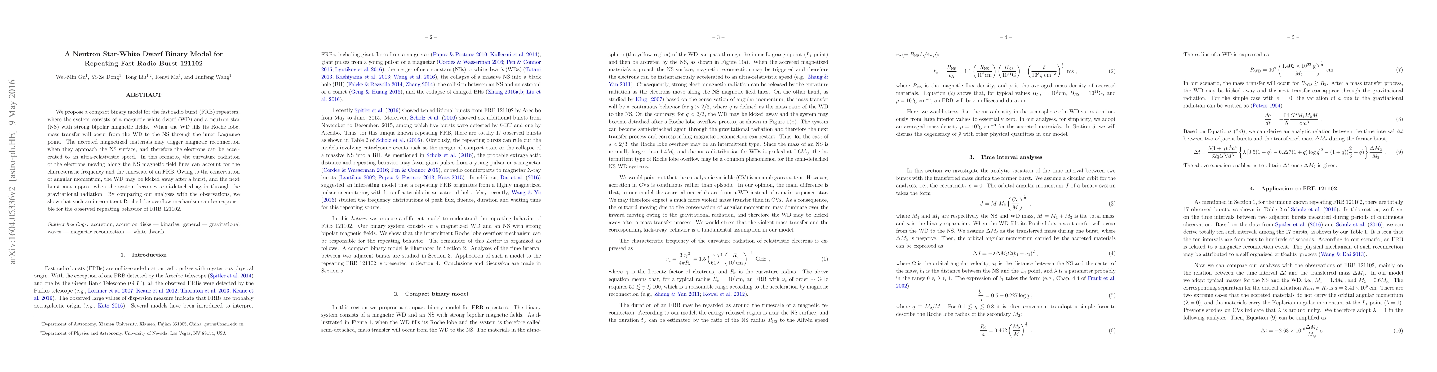 A neutron star-white dwarf binary model proposes that magnetic reconnection of accreted material can trigger fast radio bursts (FRBs), accounting for their characteristic frequency and timescale. This mechanism may be responsible for the observed repeating behavior of FRB 121102.